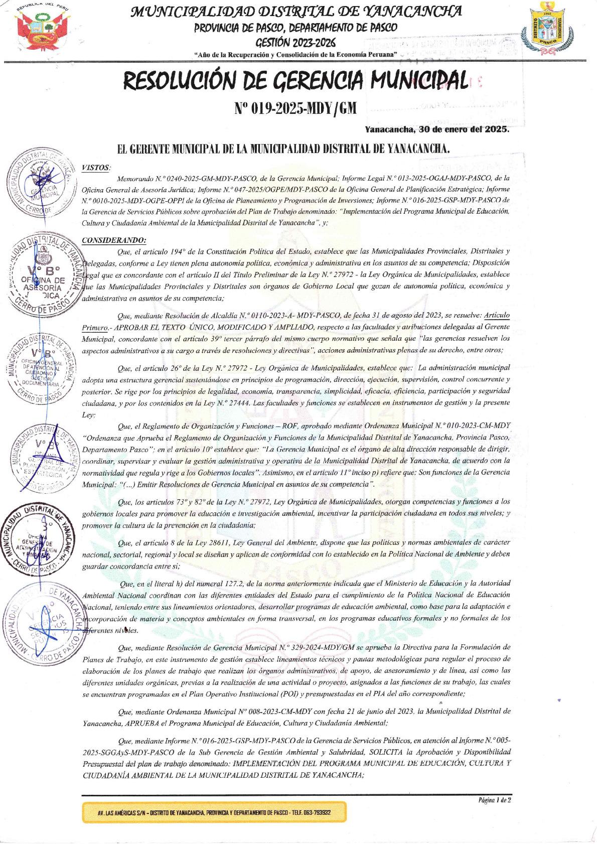 La presente Resolución de Gerencia Municipal aprueba el Plan de Trabajo 2025 del Programa Municipal de Educación, Cultura y Ciudadanía Ambiental de la Municipalidad Distrital de Yanacancha (Pasco), con la finalidad de definir las actividades de educación, cultura y ciudadanía ambiental que se desarrollaran en la localidad durante el presente año.