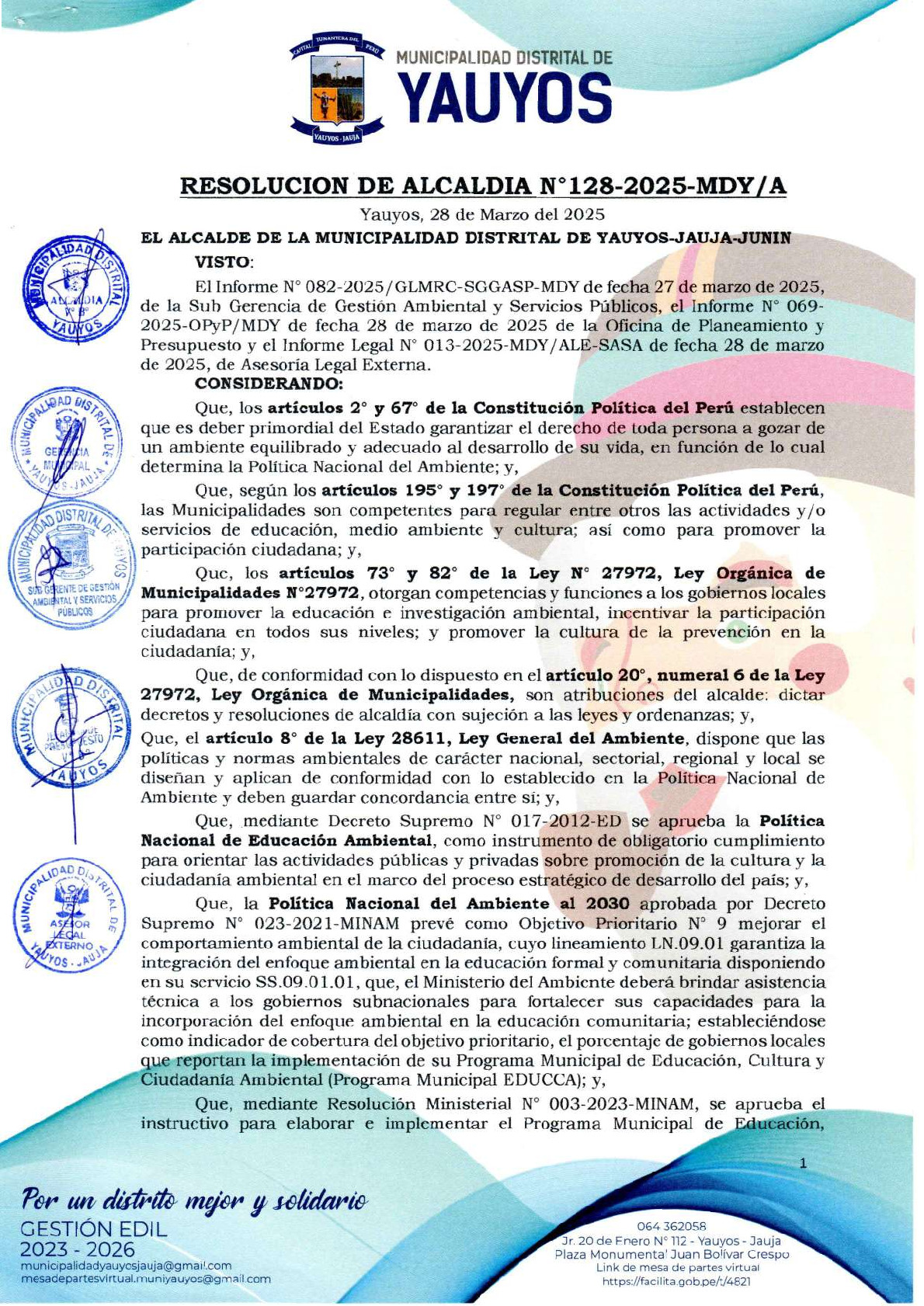 La presente Resolución de Alcaldía aprueba el Plan de Trabajo 2025 del Programa Municipal de Educación, Cultura y Ciudadanía Ambiental de la Municipalidad Distrital de Yauyos - Jauja (Junín), con la finalidad de definir las actividades de educación, cultura y ciudadanía ambiental que se desarrollaran en la localidad durante el presente año.