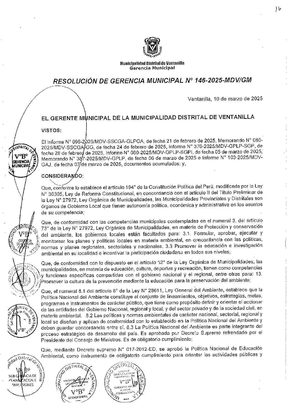 La presente Resolución de Gerencia Municipal aprueba el Plan de Trabajo 2025 del Programa Municipal de Educación, Cultura y Ciudadanía Ambiental de la Municipalidad Distrital de Ventanilla (Callao), con la finalidad de definir las actividades de educación, cultura y ciudadanía ambiental que se desarrollaran en la localidad durante el presente año.
