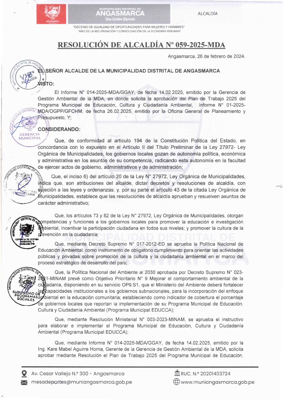 La presente Resolución de Alcaldía aprueba el Plan de Trabajo 2025 del Programa Municipal de Educación, Cultura y Ciudadanía Ambiental de la Municipalidad Distrital de Angasmarca - Santiago de Chuco (La Libertad), con la finalidad de definir las actividades de educación, cultura y ciudadanía ambiental que se desarrollaran en la localidad durante el presente año.
