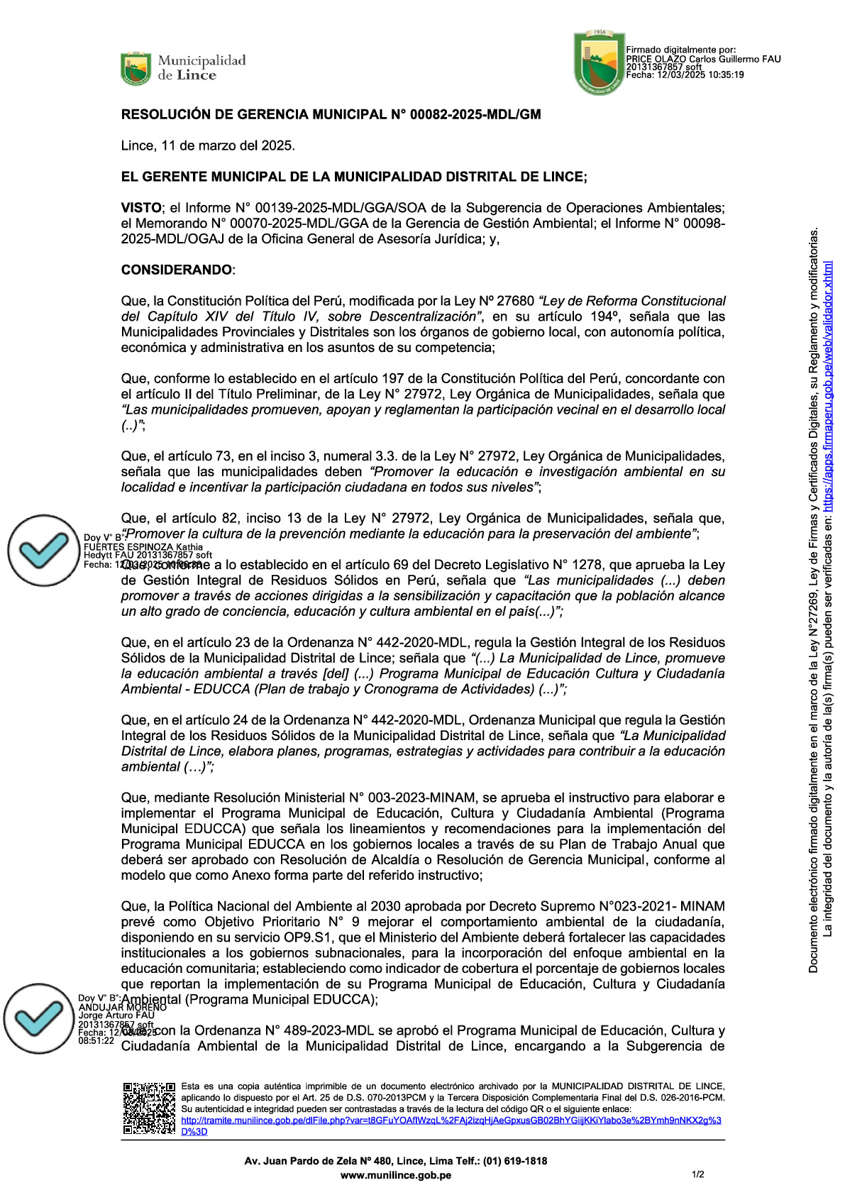 La presente Resolución de Gerencia Municipal aprueba el Plan de Trabajo 2025 del Programa Municipal de Educación, Cultura y Ciudadanía Ambiental de la Municipalidad Distrital de Lince (Lima Metropolitana), con la finalidad de definir las actividades de educación, cultura y ciudadanía ambiental que se desarrollaran en la localidad durante el presente año.