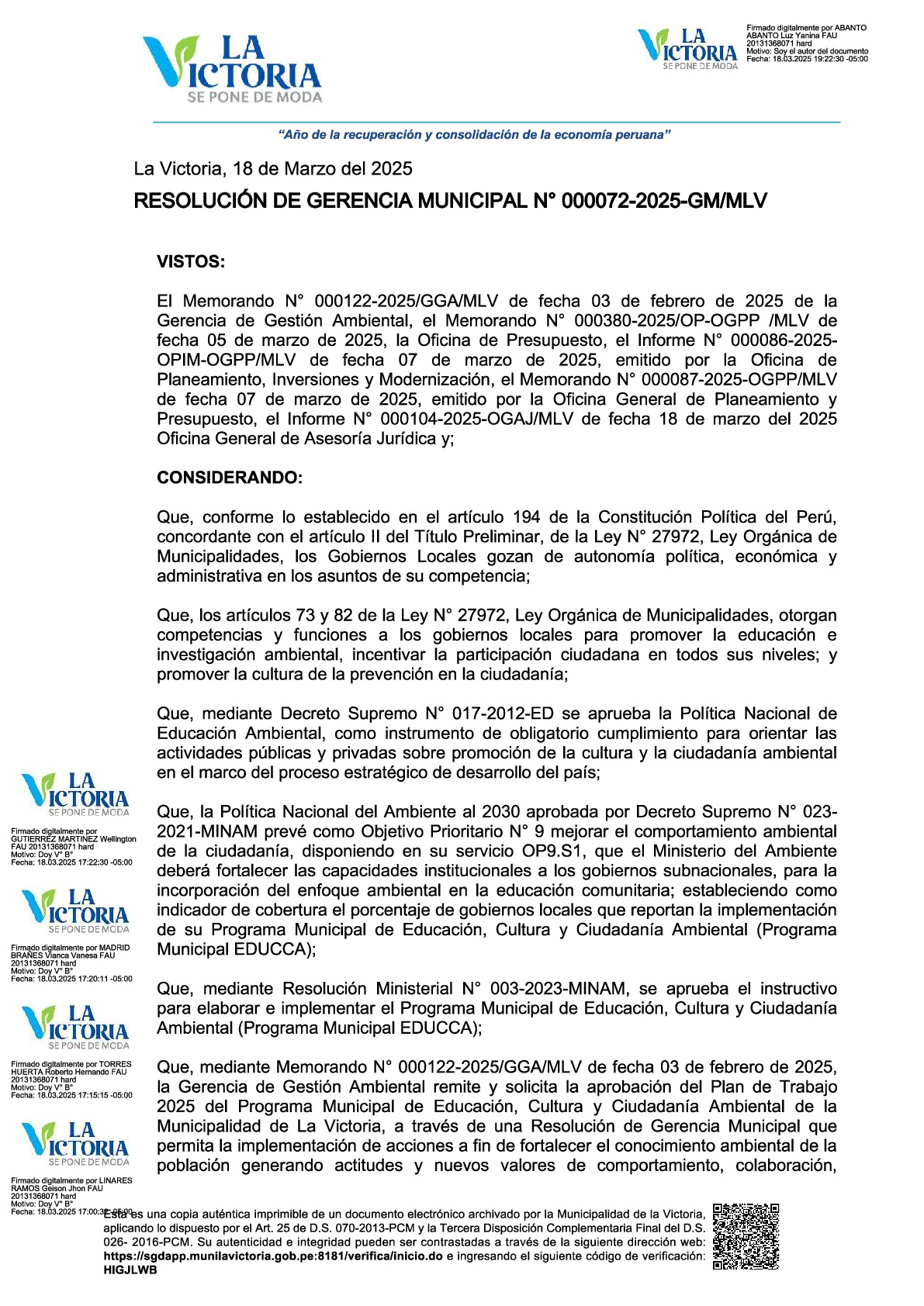 La presente Resolución de Gerencia Municipal aprueba el Plan de Trabajo 2025 del Programa Municipal de Educación, Cultura y Ciudadanía Ambiental de la Municipalidad Distrital de La Victoria (Lima Metropolitana), con la finalidad de definir las actividades de educación, cultura y ciudadanía ambiental que se desarrollaran en la localidad durante el presente año.