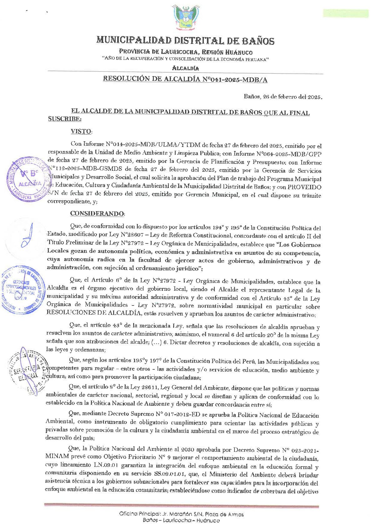 La presente Resolución de Alcaldía aprueba el Plan de Trabajo 2025 del Programa Municipal de Educación, Cultura y Ciudadanía Ambiental de la Municipalidad Distrital de Baños -Lauricocha (Huánuco), con la finalidad de definir las actividades de educación, cultura y ciudadanía ambiental que se desarrollaran en la localidad durante el presente año.