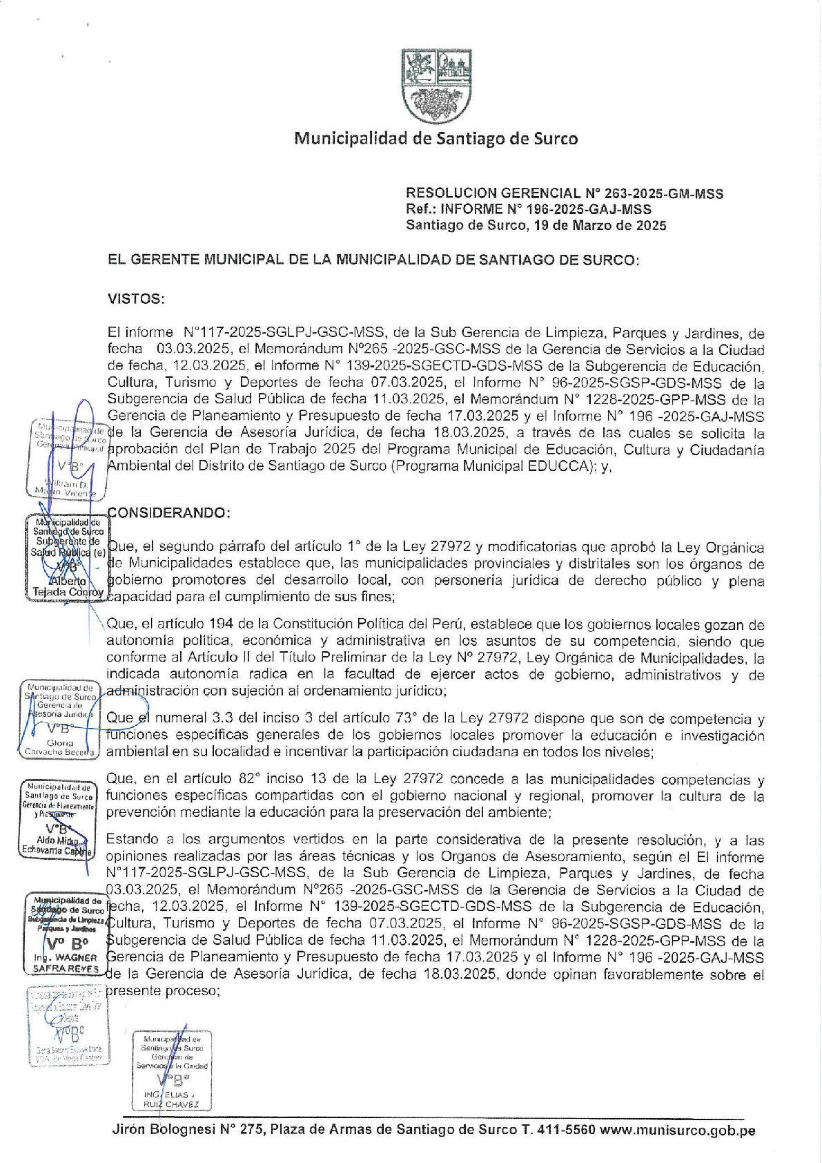 La presente Resolución de Gerencia Municipal aprueba el Plan de Trabajo 2025 del Programa Municipal de Educación, Cultura y Ciudadanía Ambiental de la Municipalidad Distrital de Santiago de Surco (Lima Metropolitana), con la finalidad de definir las actividades de educación, cultura y ciudadanía ambiental que se desarrollaran en la localidad durante el presente año.