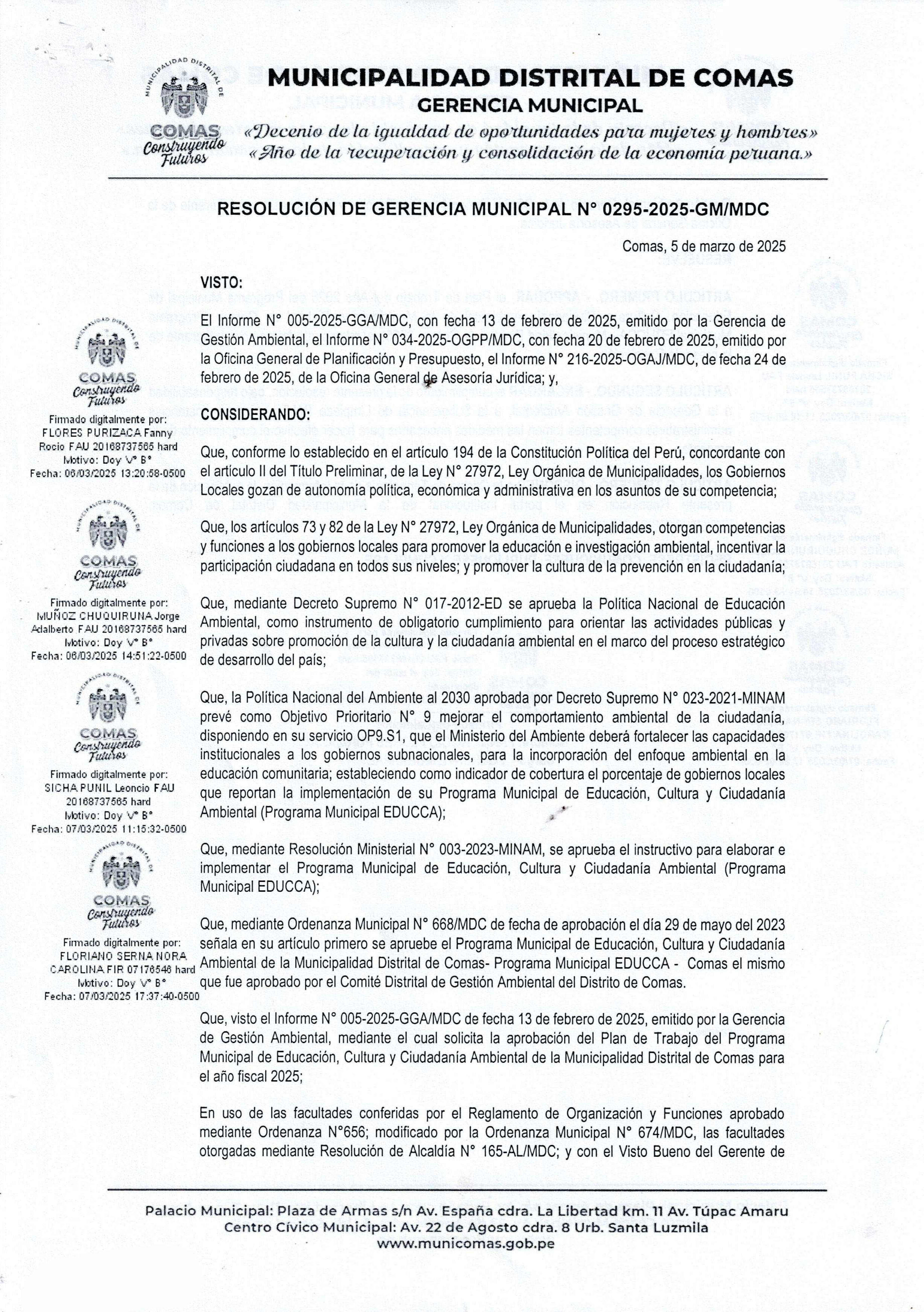 La presente Resolución de Gerencia Municipal aprueba el Plan de Trabajo 2025 del Programa Municipal de Educación, Cultura y Ciudadanía Ambiental de la Municipalidad Distrital de Comas (Lima Metropolitana), con la finalidad de definir las actividades de educación, cultura y ciudadanía ambiental que se desarrollaran en la localidad durante el presente año.