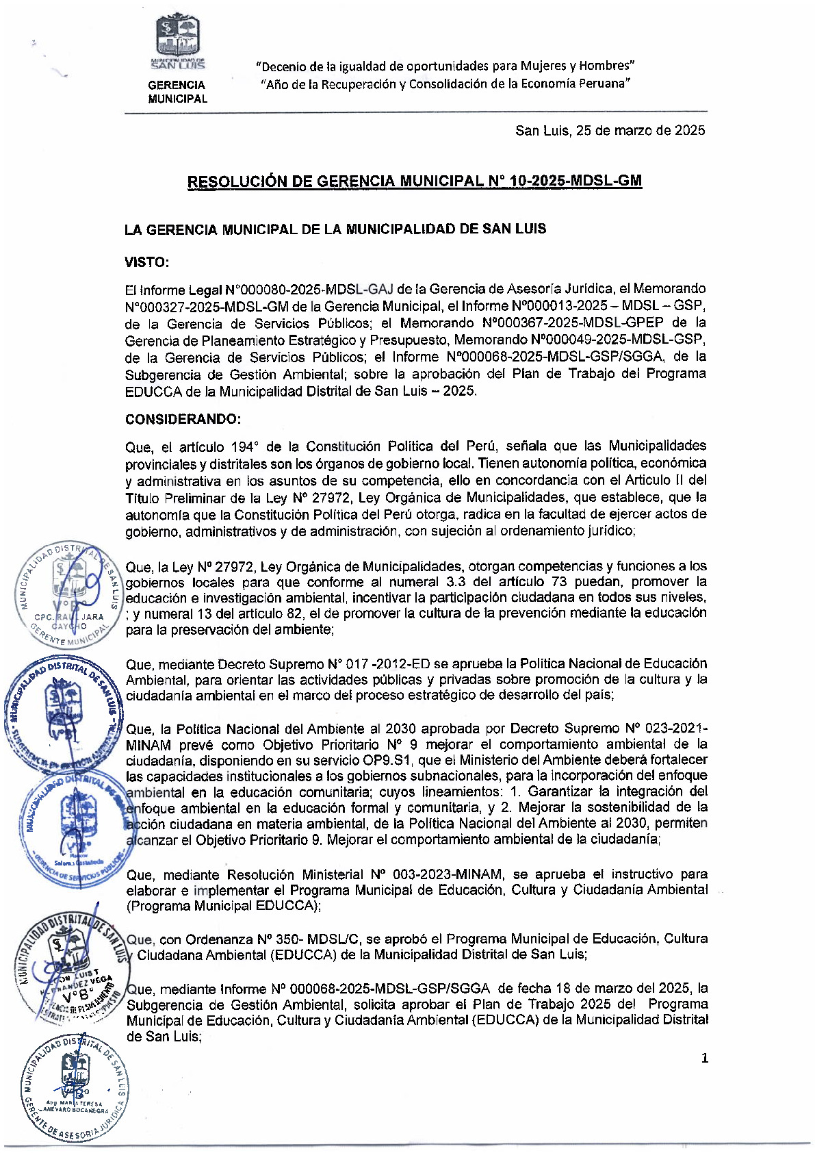 La presente Resolución de Gerencia Municipal aprueba el Plan de Trabajo 2025 del Programa Municipal de Educación, Cultura y Ciudadanía Ambiental de la Municipalidad Distrital de San Luis (Lima Metropolitana), con la finalidad de definir las actividades de educación, cultura y ciudadanía ambiental que se desarrollaran en la localidad durante el presente año.