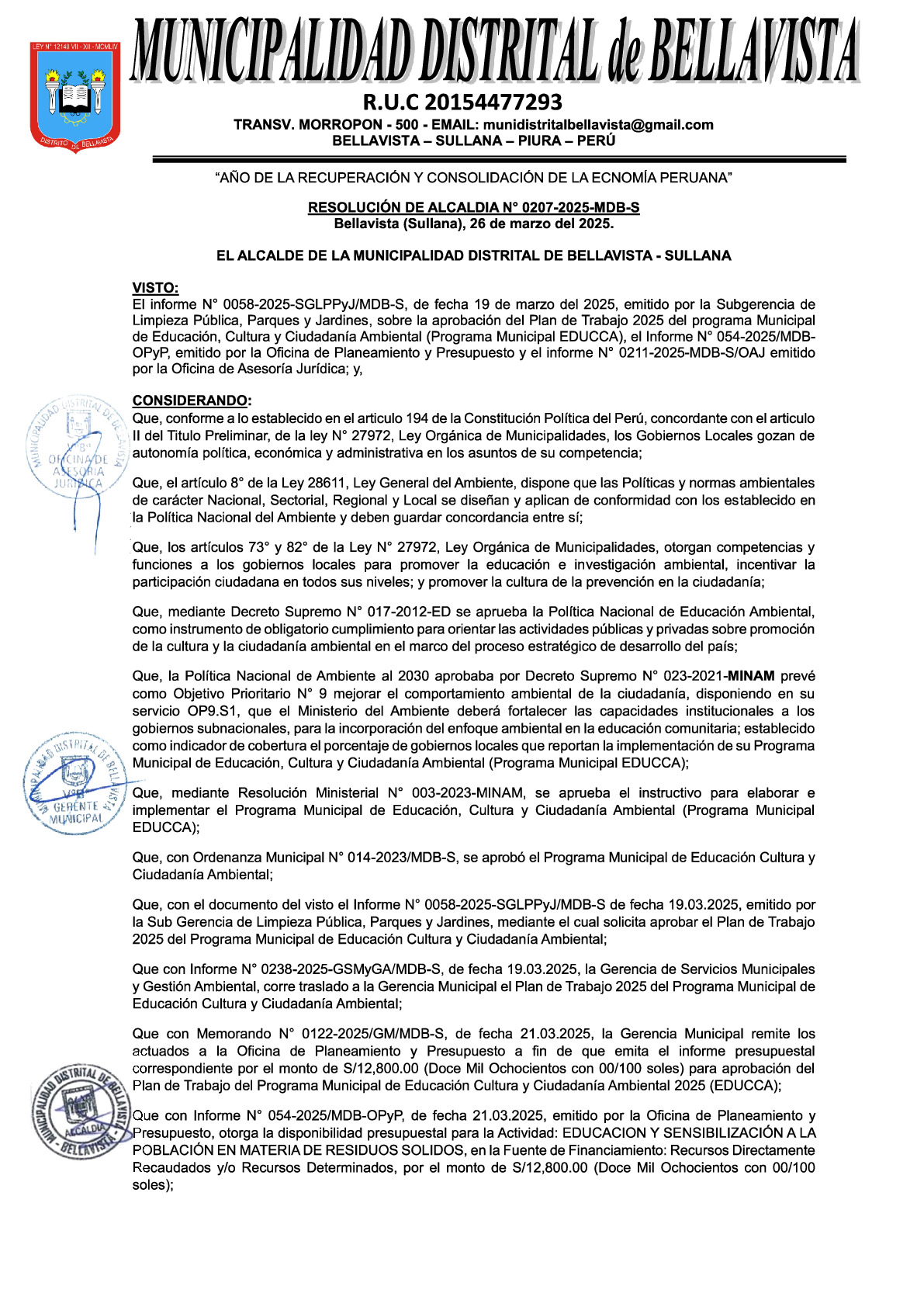La presente Resolución de Alcaldía aprueba el Plan de Trabajo 2025 del Programa Municipal de Educación, Cultura y Ciudadanía Ambiental de la Municipalidad Distrital de Bellavista -Sullana (Piura), con la finalidad de definir las actividades de educación, cultura y ciudadanía ambiental que se desarrollaran en la localidad durante el presente año.