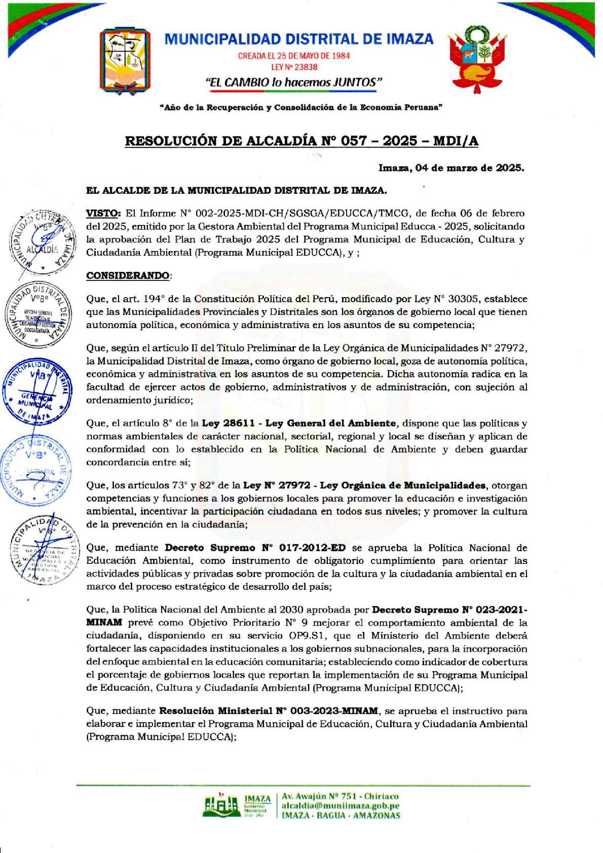 La presente Resolución de Alcaldía aprueba el Plan de Trabajo 2025 del Programa Municipal de Educación, Cultura y Ciudadanía Ambiental de la Municipalidad Distrital de Imaza - Bagua (Amazonas), con la finalidad de definir las actividades de educación, cultura y ciudadanía ambiental que se desarrollaran en la localidad durante el presente año.