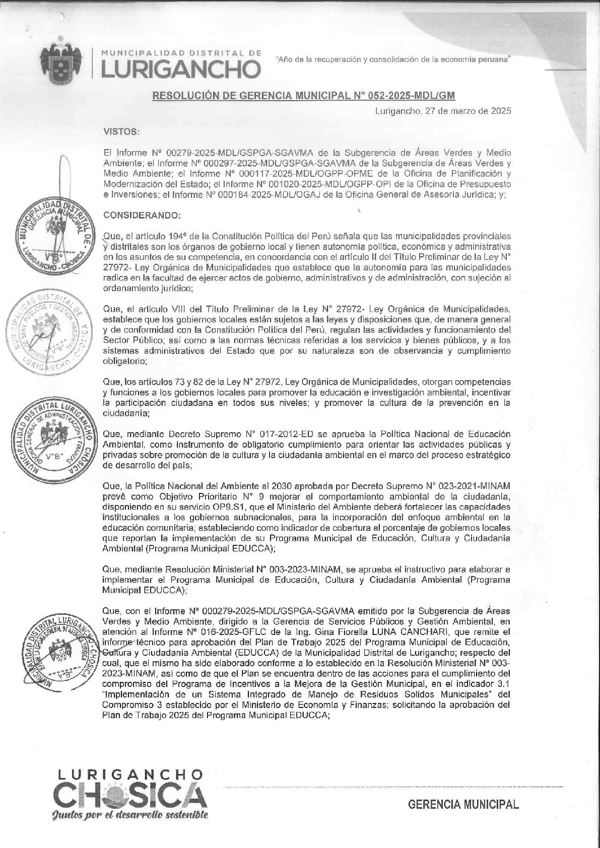 La presente Resolución de Gerencia Municipal aprueba el Plan de Trabajo 2025 del Programa Municipal de Educación, Cultura y Ciudadanía Ambiental de la Municipalidad Distrital de Lurigancho (Lima Metropolitana), con la finalidad de definir las actividades de educación, cultura y ciudadanía ambiental que se desarrollaran en la localidad durante el presente año.