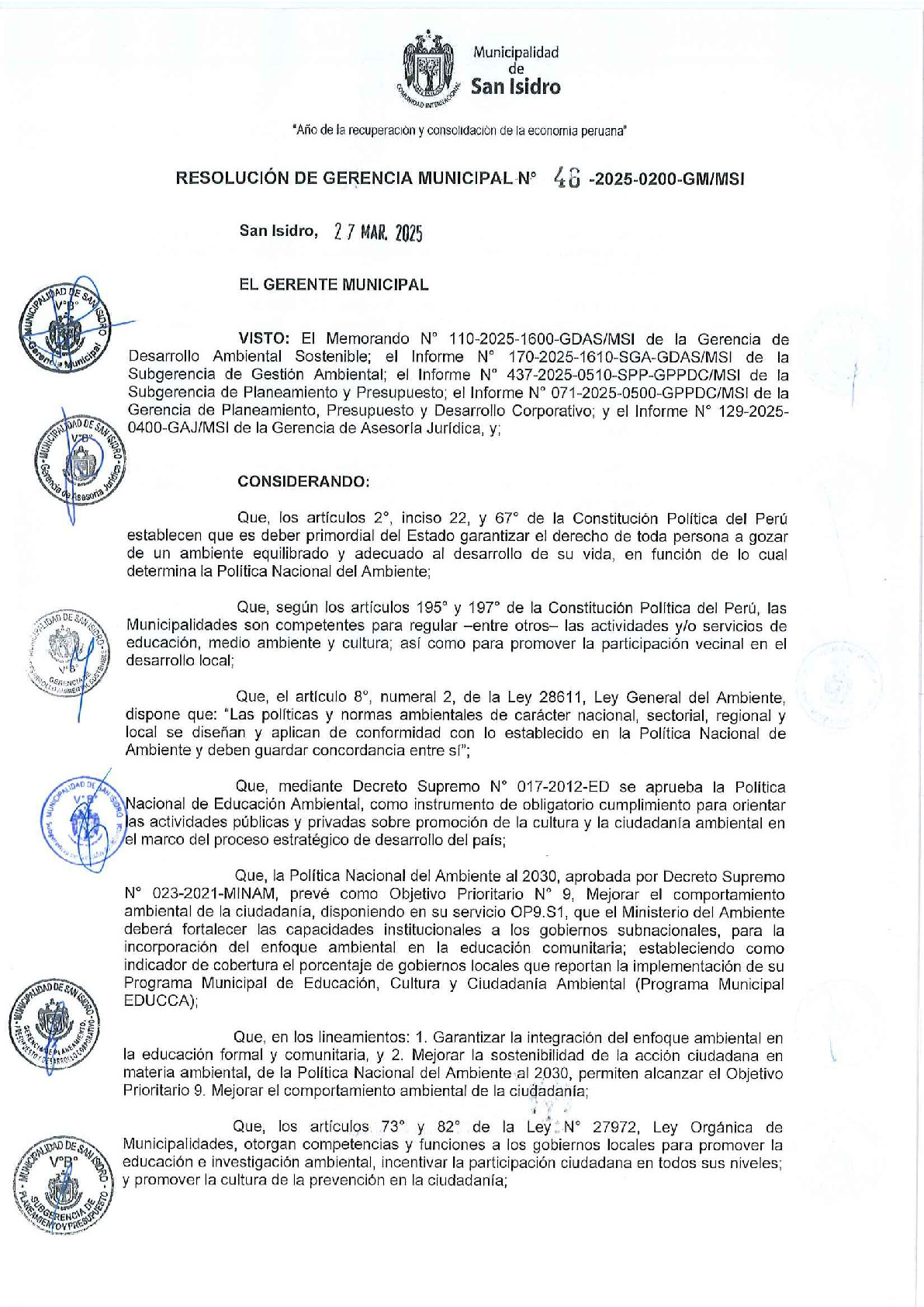 La presente Resolución de Gerencia Municipal aprueba el Plan de Trabajo 2025 del Programa Municipal de Educación, Cultura y Ciudadanía Ambiental de la Municipalidad Distrital de San Isidro (Lima Metropolitana), con la finalidad de definir las actividades de educación, cultura y ciudadanía ambiental que se desarrollaran en la localidad durante el presente año.