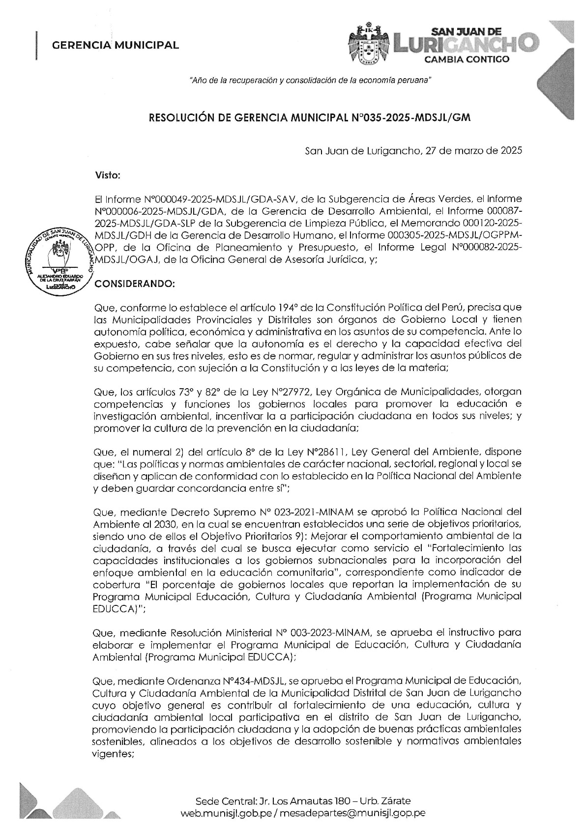 La presente Resolución de Gerencia Municipal aprueba el Plan de Trabajo 2025 del Programa Municipal de Educación, Cultura y Ciudadanía Ambiental de la Municipalidad Distrital de San Juan de Lurigancho (Lima Metropolitana), con la finalidad de definir las actividades de educación, cultura y ciudadanía ambiental que se desarrollaran en la localidad durante el presente año.