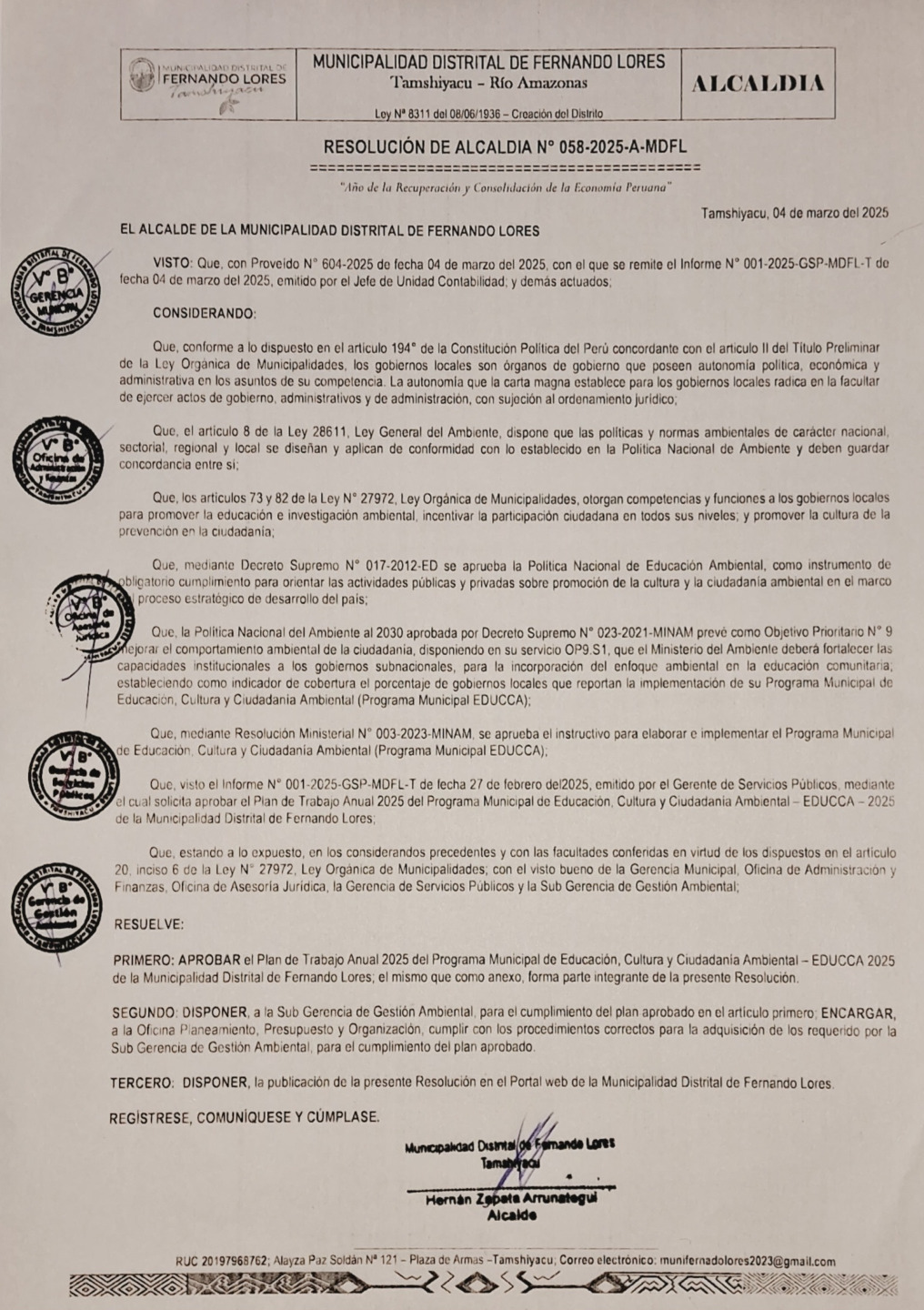 La presente Resolución de Alcaldía aprueba el Plan de Trabajo 2025 del Programa Municipal de Educación, Cultura y Ciudadanía Ambiental de la Municipalidad Distrital de Fernando Lores - Maynas (Loreto), con la finalidad de definir las actividades de educación, cultura y ciudadanía ambiental que se desarrollaran en la localidad durante el presente año.