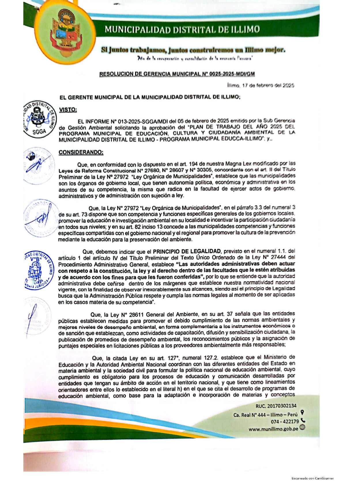 La presente Resolución de Gerencia Municipal aprueba el Plan de Trabajo 2025 del Programa Municipal de Educación, Cultura y Ciudadanía Ambiental de la Municipalidad Distrital de Illimo - Lambayeque (Lambayeque), con la finalidad de definir las actividades de educación, cultura y ciudadanía ambiental que se desarrollaran en la localidad durante el presente año.