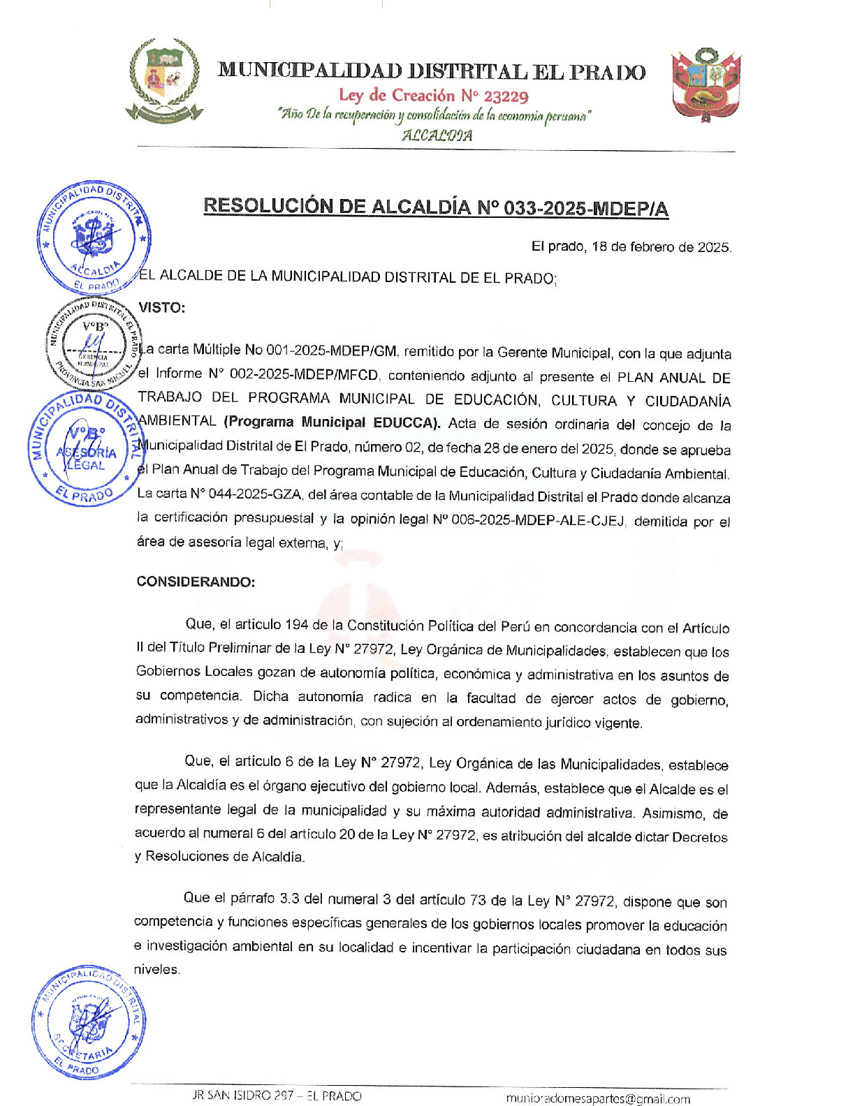 La presente Resolución de Alcaldía aprueba el Plan de Trabajo 2025 del Programa Municipal de Educación, Cultura y Ciudadanía Ambiental de la Municipalidad Distrital de El Prado - San Miguel (Cajamarca), con la finalidad de definir las actividades de educación, cultura y ciudadanía ambiental que se desarrollaran en la localidad durante el presente año.