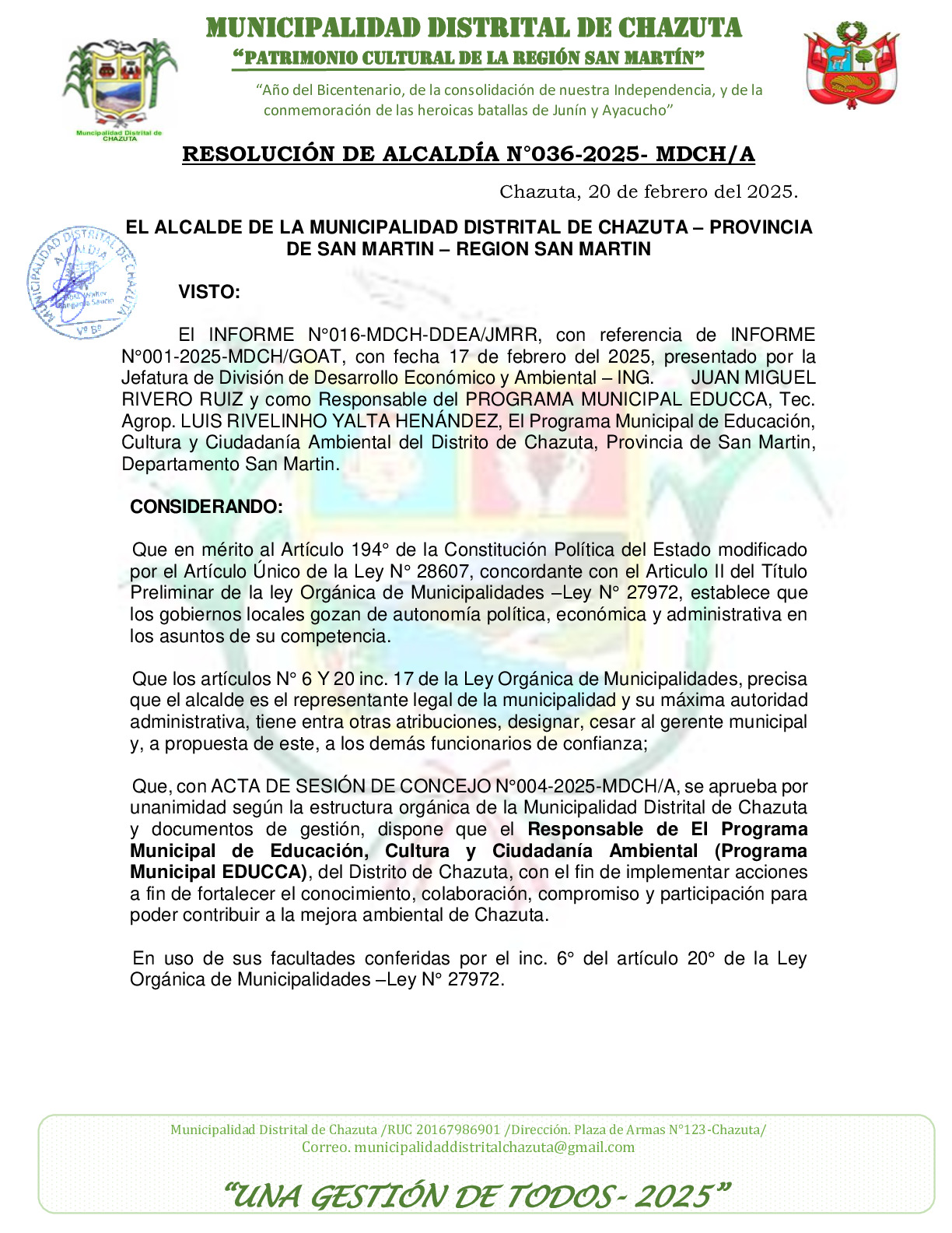 La presente Resolución de Alcaldía aprueba el Plan de Trabajo 2025 del Programa Municipal de Educación, Cultura y Ciudadanía Ambiental de la Municipalidad Distrital de Chazuta - San Martín (San Martín), con la finalidad de definir las actividades de educación, cultura y ciudadanía ambiental que se desarrollaran en la localidad durante el presente año.