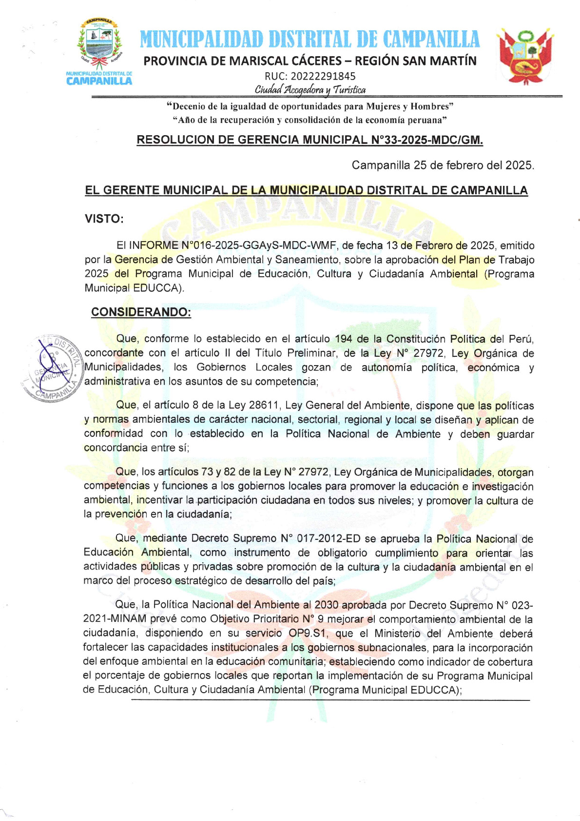 La presente Resolución de Gerencia Municipal aprueba el Plan de Trabajo 2025 del Programa Municipal de Educación, Cultura y Ciudadanía Ambiental de la Municipalidad Distrital de Campanilla - Mariscal Cáceres (San Martín), con la finalidad de definir las actividades de educación, cultura y ciudadanía ambiental que se desarrollaran en la localidad durante el presente año.