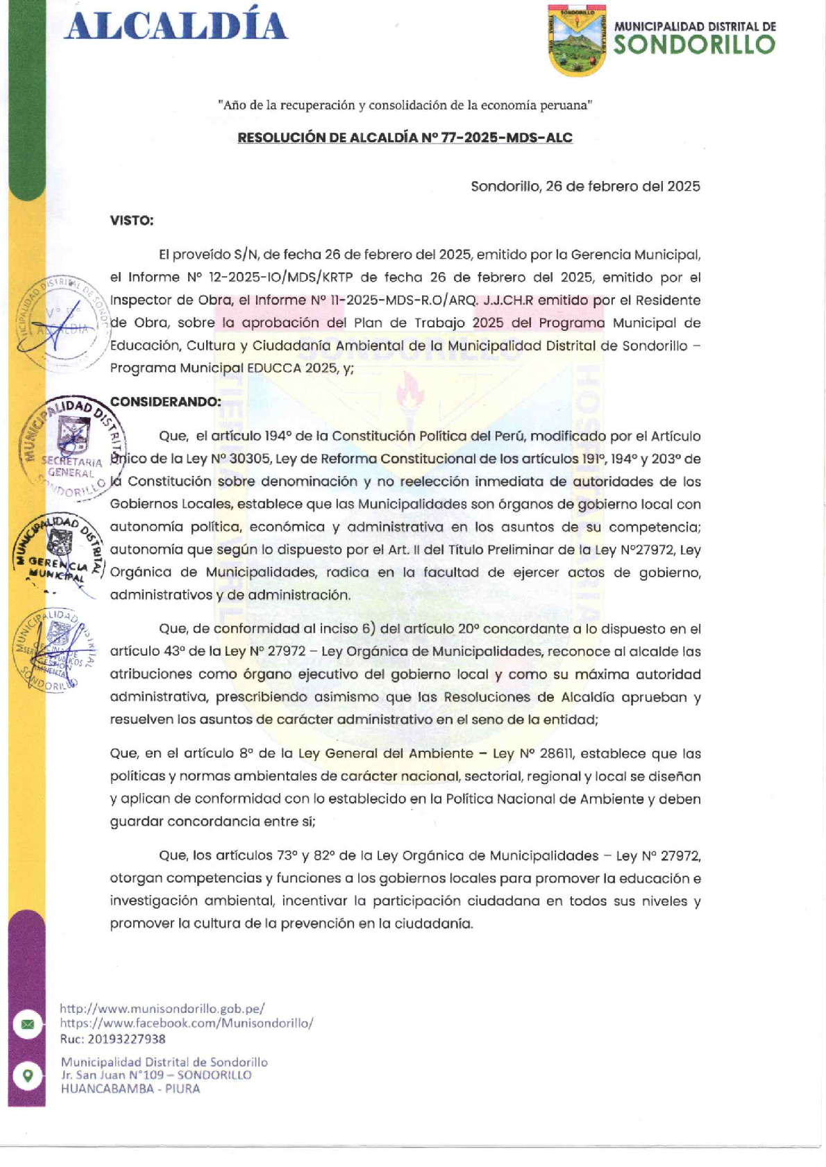 La presente Resolución de Alcaldía aprueba el Plan de Trabajo 2025 del Programa Municipal de Educación, Cultura y Ciudadanía Ambiental de la Municipalidad Distrital de Sondorillo -Huancabamba (Piura), con la finalidad de definir las actividades de educación, cultura y ciudadanía ambiental que se desarrollaran en la localidad durante el presente año.
