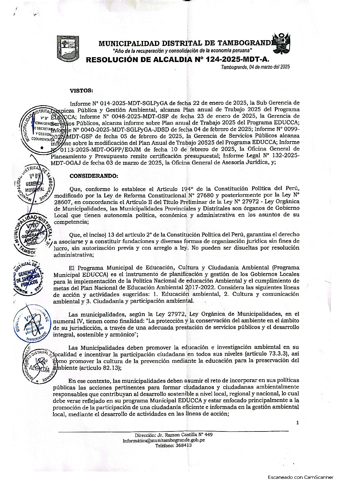 La presente Resolución de Alcaldía aprueba el Plan de Trabajo 2025 del Programa Municipal de Educación, Cultura y Ciudadanía Ambiental de la Municipalidad Distrital de Tambogrande - Piura (Piura), con la finalidad de definir las actividades de educación, cultura y ciudadanía ambiental que se desarrollaran en la localidad durante el presente año.