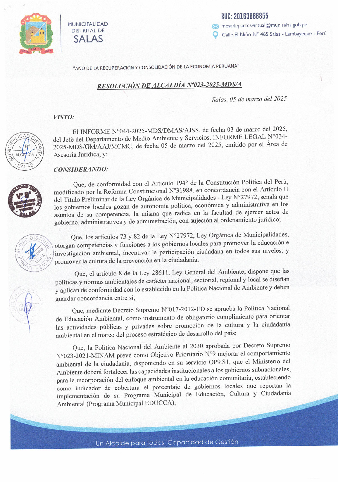 La presente Resolución de Alcaldía aprueba el Plan de Trabajo 2025 del Programa Municipal de Educación, Cultura y Ciudadanía Ambiental de la Municipalidad Distrital de Salas -Lambayeque (Lambayeque), con la finalidad de definir las actividades de educación, cultura y ciudadanía ambiental que se desarrollaran en la localidad durante el presente año.