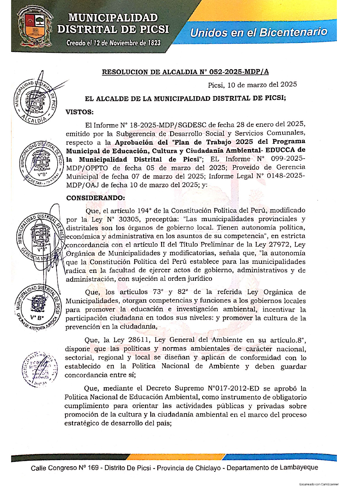 La presente Resolución de Alcaldía aprueba el Plan de Trabajo 2025 del Programa Municipal de Educación, Cultura y Ciudadanía Ambiental de la Municipalidad Distrital de Picsi -Chiclayo (Lambayeque), con la finalidad de definir las actividades de educación, cultura y ciudadanía ambiental que se desarrollaran en la localidad durante el presente año.