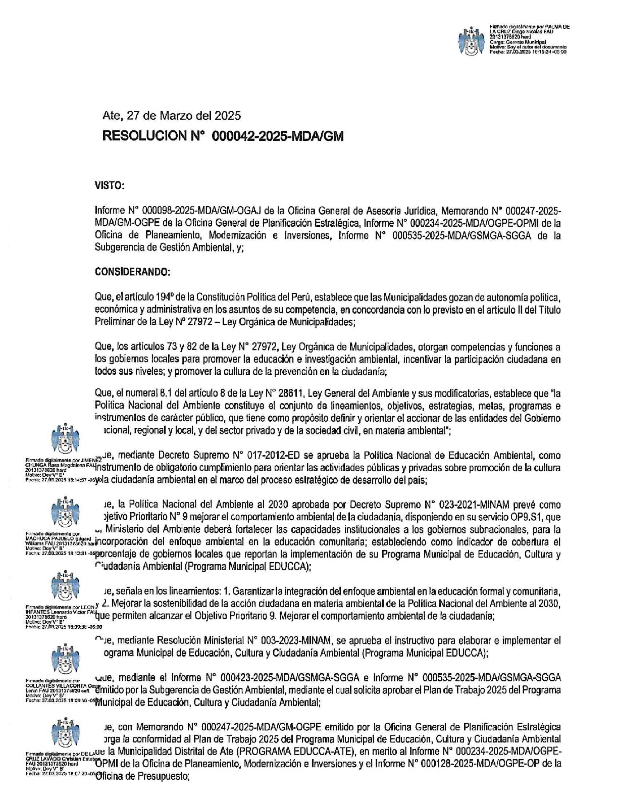 La presente Resolución de Gerencia Municipal aprueba el Plan de Trabajo 2025 del Programa Municipal de Educación, Cultura y Ciudadanía Ambiental de la Municipalidad Distrital de Ate (Lima Metropolitana), con la finalidad de definir las actividades de educación, cultura y ciudadanía ambiental que se desarrollaran en la localidad durante el presente año.