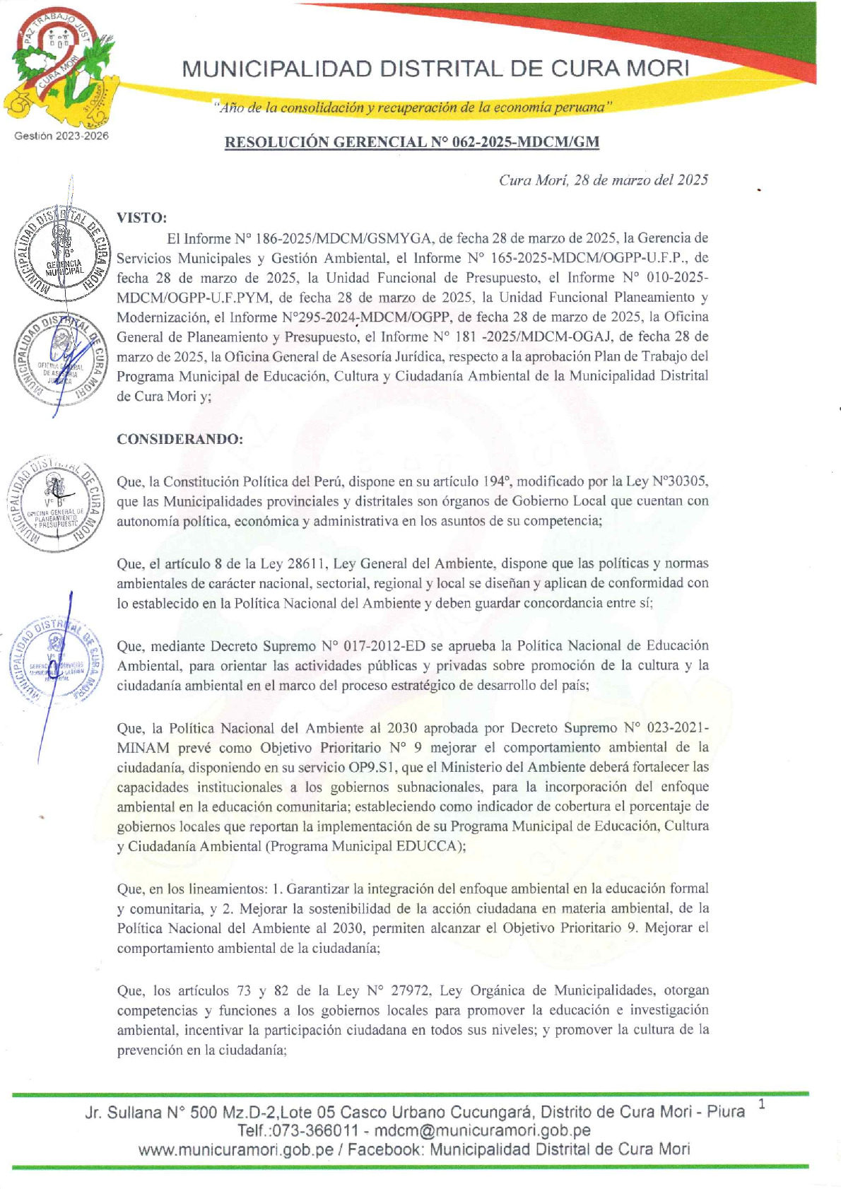 La presente Resolución de Gerencia Municipal aprueba el Plan de Trabajo 2025 del Programa Municipal de Educación, Cultura y Ciudadanía Ambiental de la Municipalidad Distrital de Cura Mori - Piura (Piura), con la finalidad de definir las actividades de educación, cultura y ciudadanía ambiental que se desarrollaran en la localidad durante el presente año.