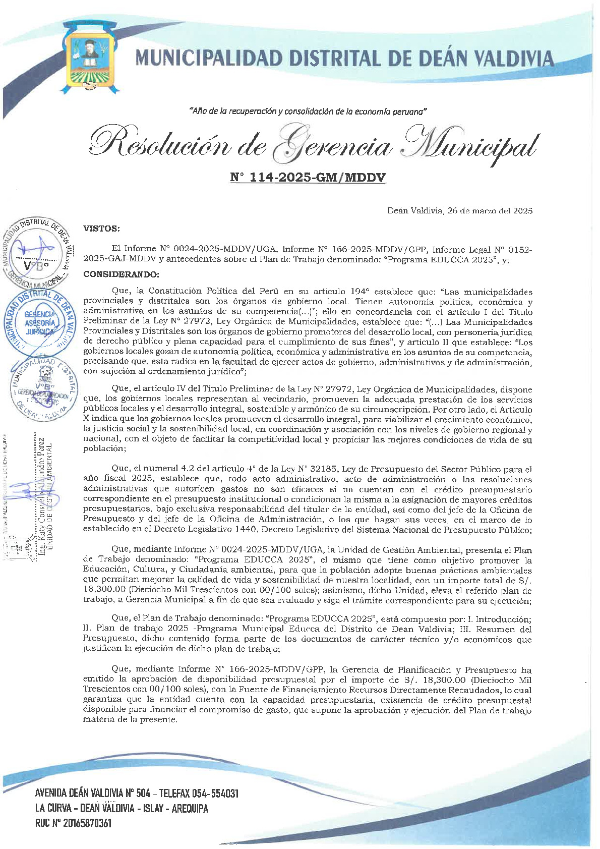 La presente Resolución de Gerencia Municipal aprueba el Plan de Trabajo 2025 del Programa Municipal de Educación, Cultura y Ciudadanía Ambiental de la Municipalidad Distrital de Deán Valdivia - Islay (Arequipa), con la finalidad de definir las actividades de educación, cultura y ciudadanía ambiental que se desarrollaran en la localidad durante el presente año.