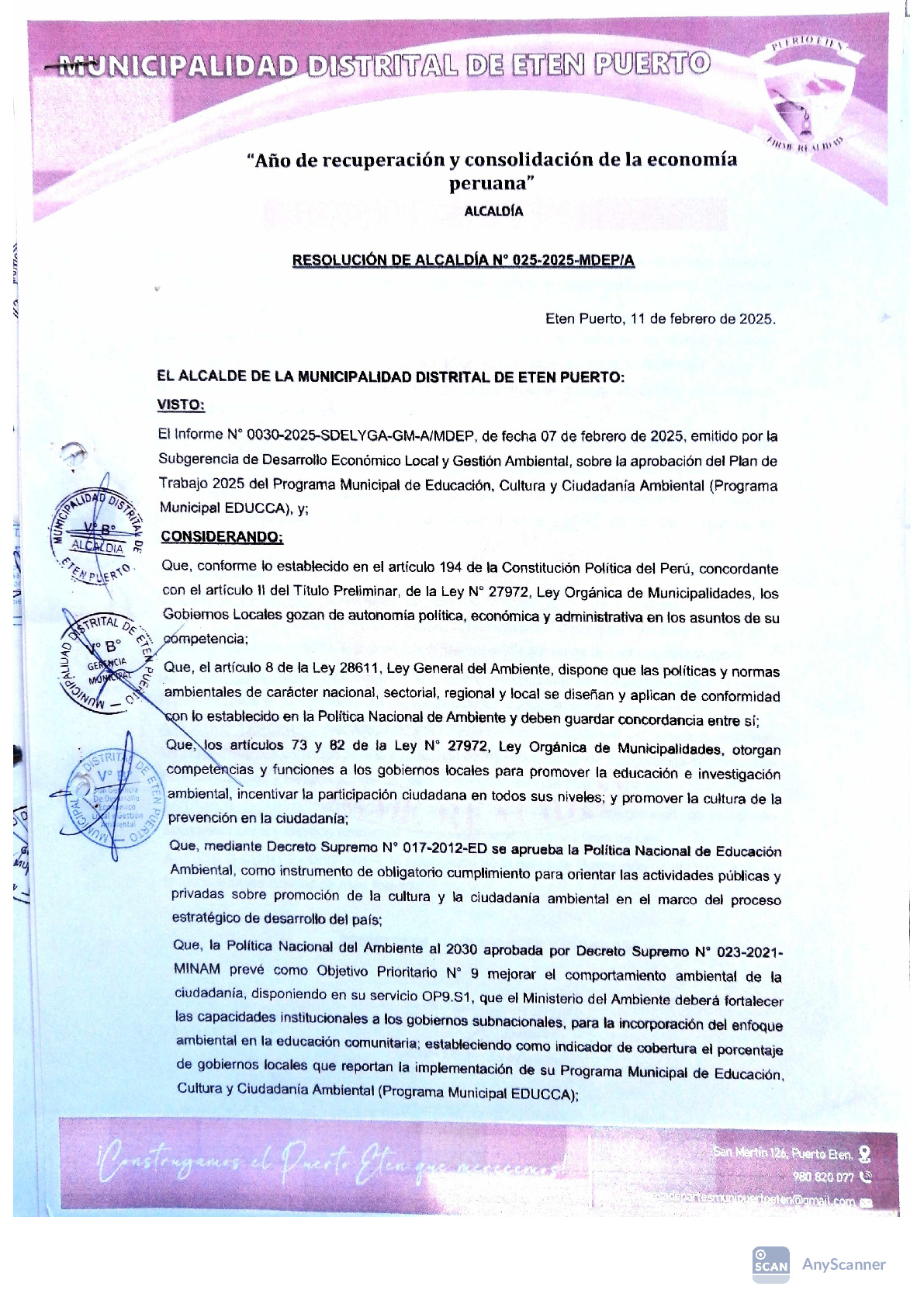 La presente Resolución de Alcaldía aprueba el Plan de Trabajo 2025 del Programa Municipal de Educación, Cultura y Ciudadanía Ambiental de la Municipalidad Distrital de Eten Puerto - Chiclayo (Lambayeque), con la finalidad de definir las actividades de educación, cultura y ciudadanía ambiental que se desarrollaran en la localidad durante el presente año.