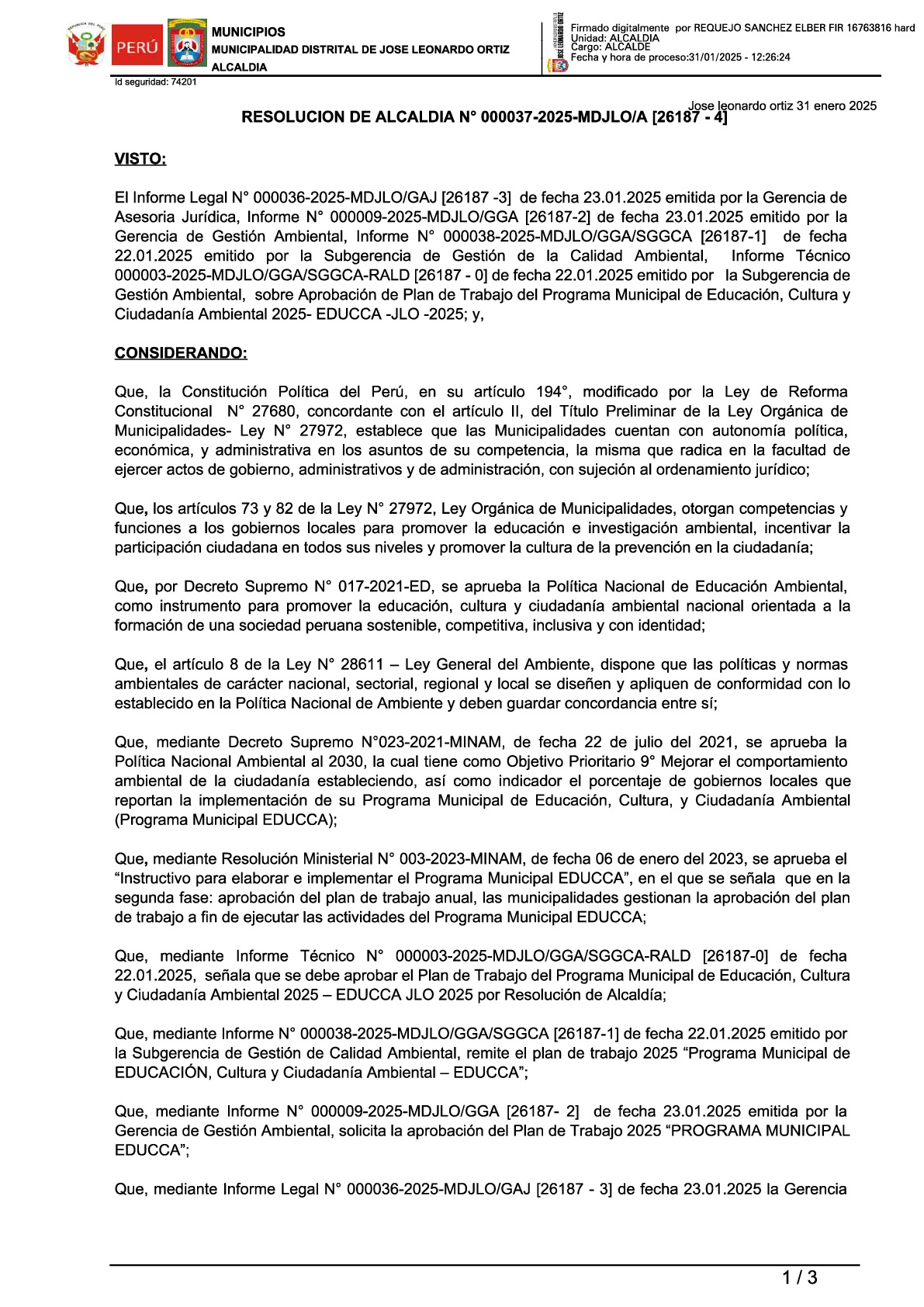 La presente Resolución de Alcaldía aprueba el Plan de Trabajo 2025 del Programa Municipal de Educación, Cultura y Ciudadanía Ambiental de la Municipalidad Distrital de José Leonardo Ortiz - Chiclayo (Lambayeque), con la finalidad de definir las actividades de educación, cultura y ciudadanía ambiental que se desarrollaran en la localidad durante el presente año.