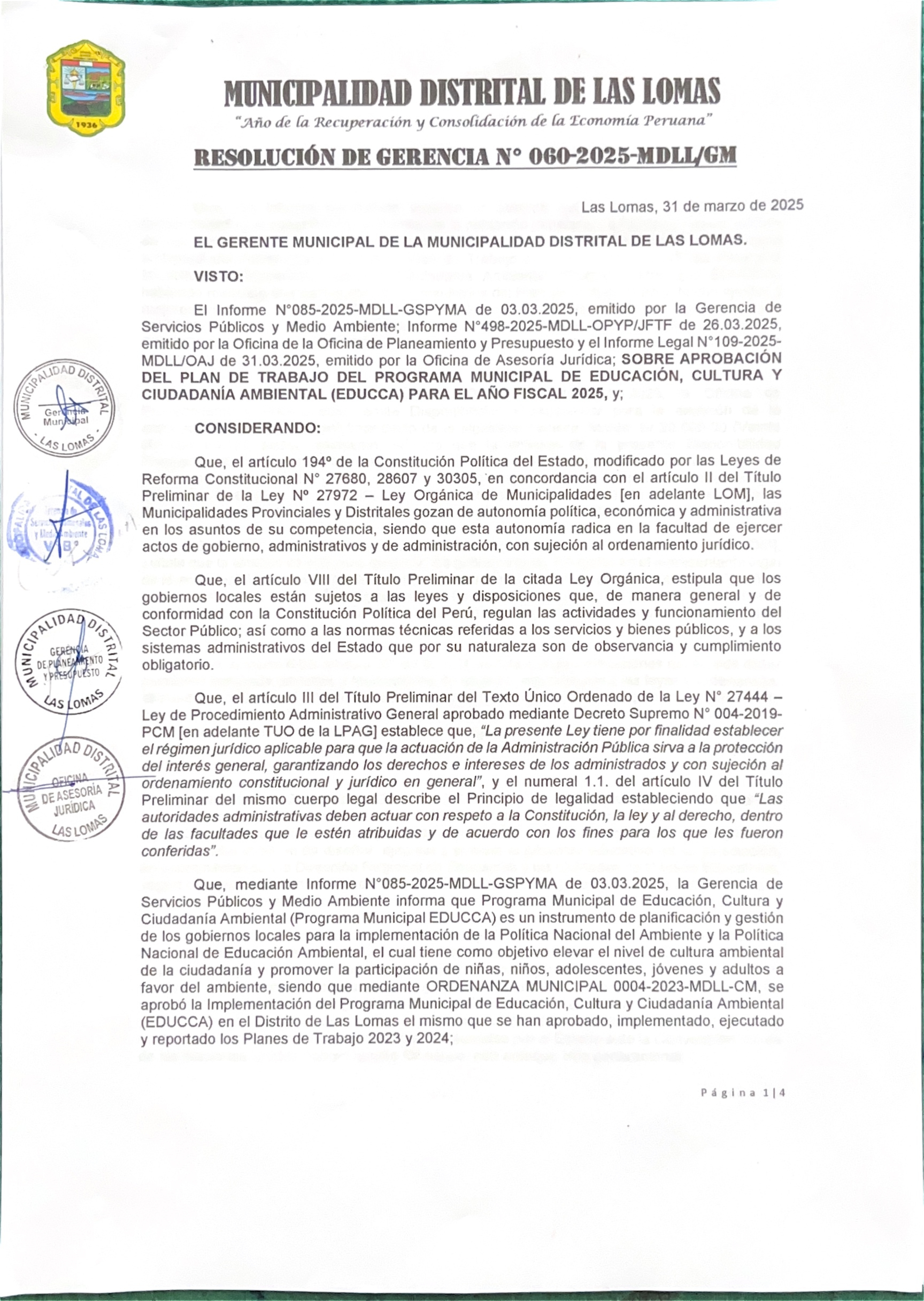 La presente Resolución de Gerencia Municipal aprueba el Plan de Trabajo 2025 del Programa Municipal de Educación, Cultura y Ciudadanía Ambiental de la Municipalidad Distrital de Las Lomas - Piura (Piura), con la finalidad de definir las actividades de educación, cultura y ciudadanía ambiental que se desarrollaran en la localidad durante el presente año.