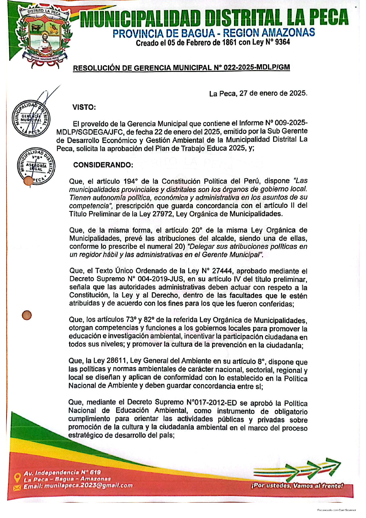 La presente Resolución de Gerencia Municipal aprueba el Plan de Trabajo 2025 del Programa Municipal de Educación, Cultura y Ciudadanía Ambiental de la Municipalidad Distrital de La Peca - Bagua (Amazonas), con la finalidad de definir las actividades de educación, cultura y ciudadanía ambiental que se desarrollaran en la localidad durante el presente año.