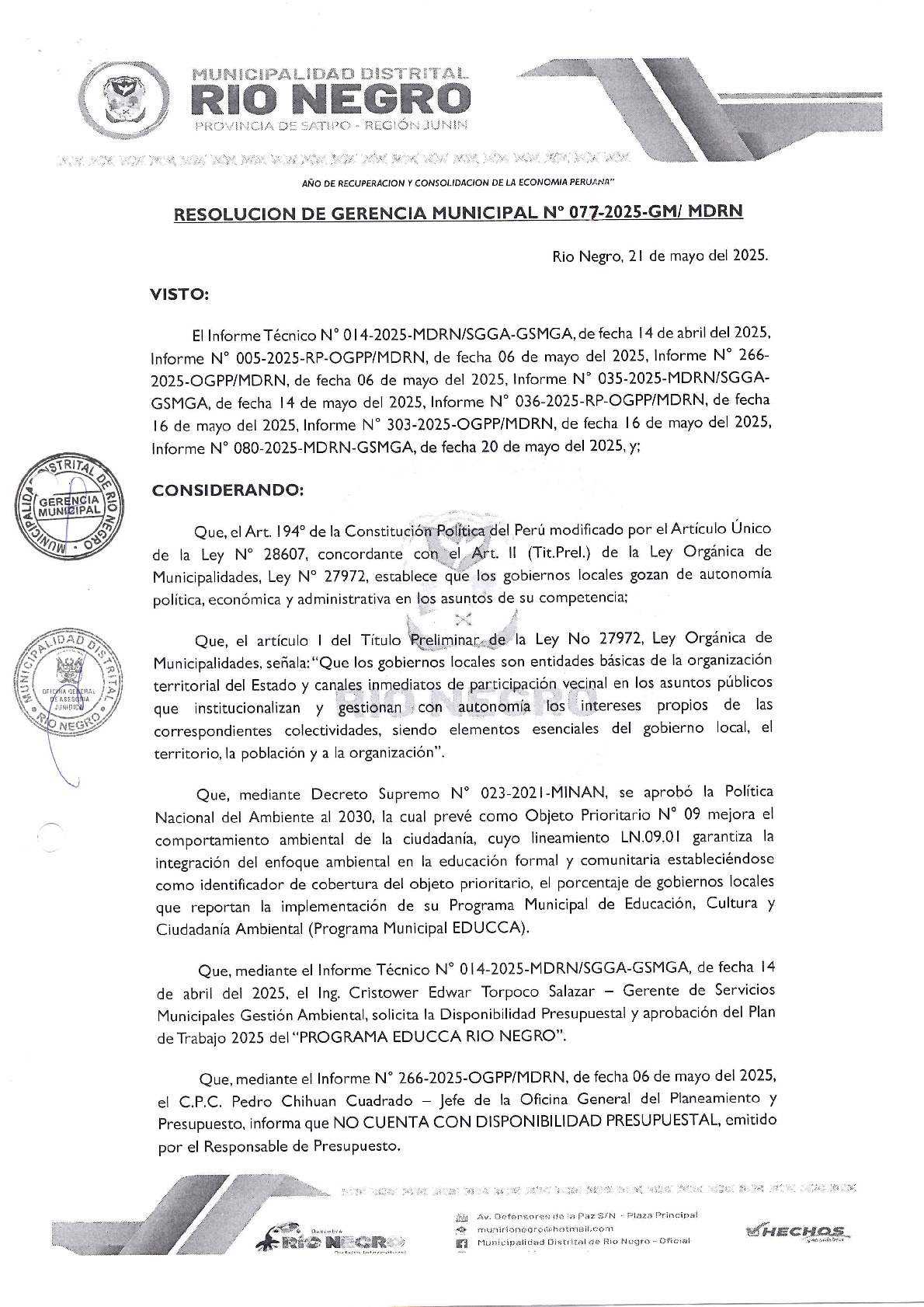 La presente Resolución de Gerencia Municipal aprueba el Plan de Trabajo 2025 del Programa Municipal de Educación, Cultura y Ciudadanía Ambiental de la Municipalidad Distrital de Rio Negro (Junín), con la finalidad de definir las actividades de educación, cultura y ciudadanía ambiental que se desarrollaran en la localidad durante el presente año.