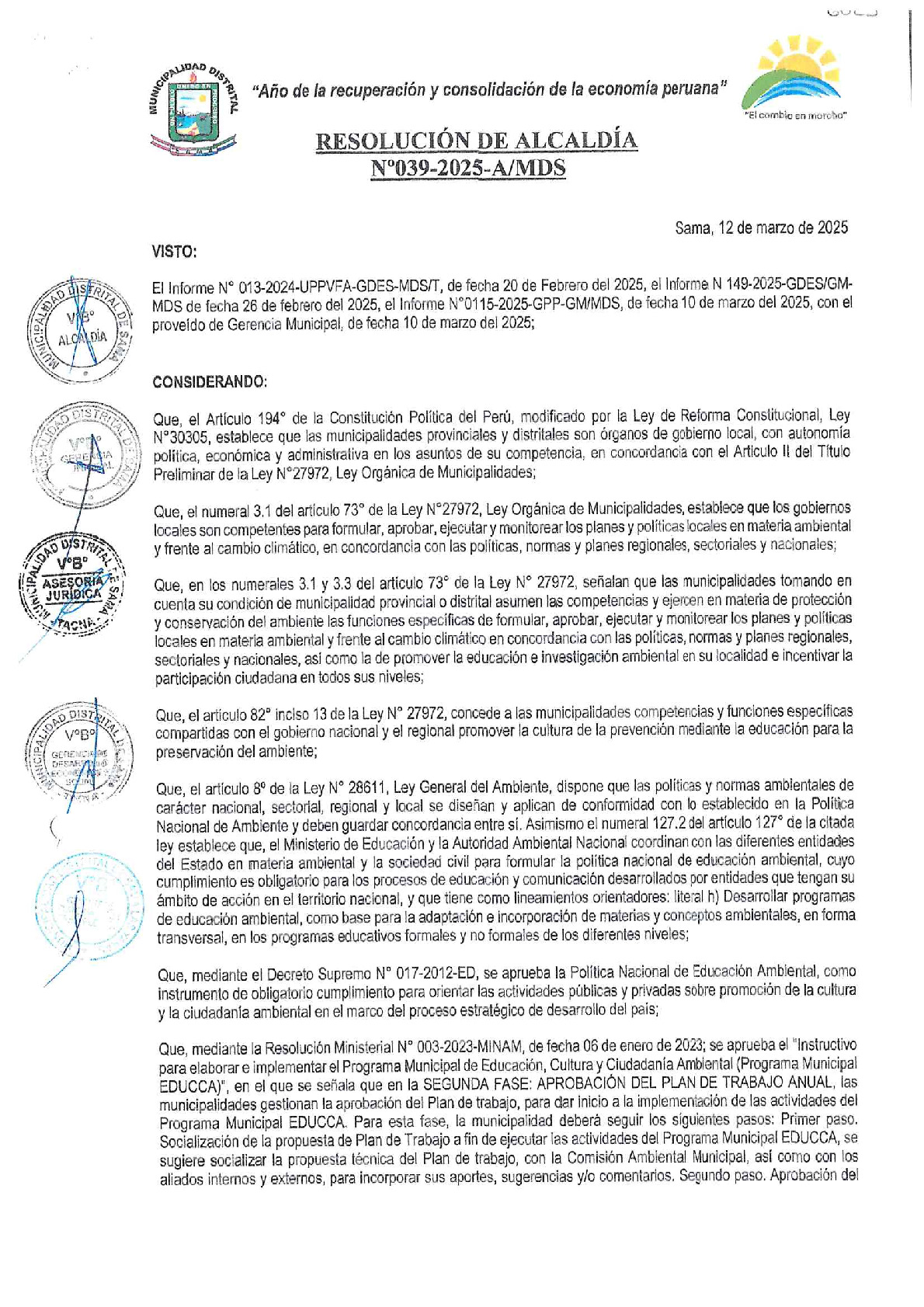 La presente Resolución de Alcaldía aprueba el Plan de Trabajo 2025 del Programa Municipal de Educación, Cultura y Ciudadanía Ambiental de la Municipalidad Distrital de Sama - Tacna (Tacna), con la finalidad de definir las actividades de educación, cultura y ciudadanía ambiental que se desarrollaran en la localidad durante el presente año.