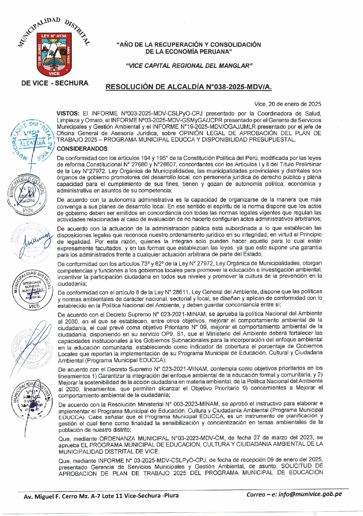 La presente Resolución de Alcaldía aprueba el Plan de Trabajo 2025 del Programa Municipal de Educación, Cultura y Ciudadanía Ambiental de la Municipalidad Distrital de Vice - Sechura (Piura), con la finalidad de definir las actividades de educación, cultura y ciudadanía ambiental que se desarrollaran en la localidad durante el presente año.