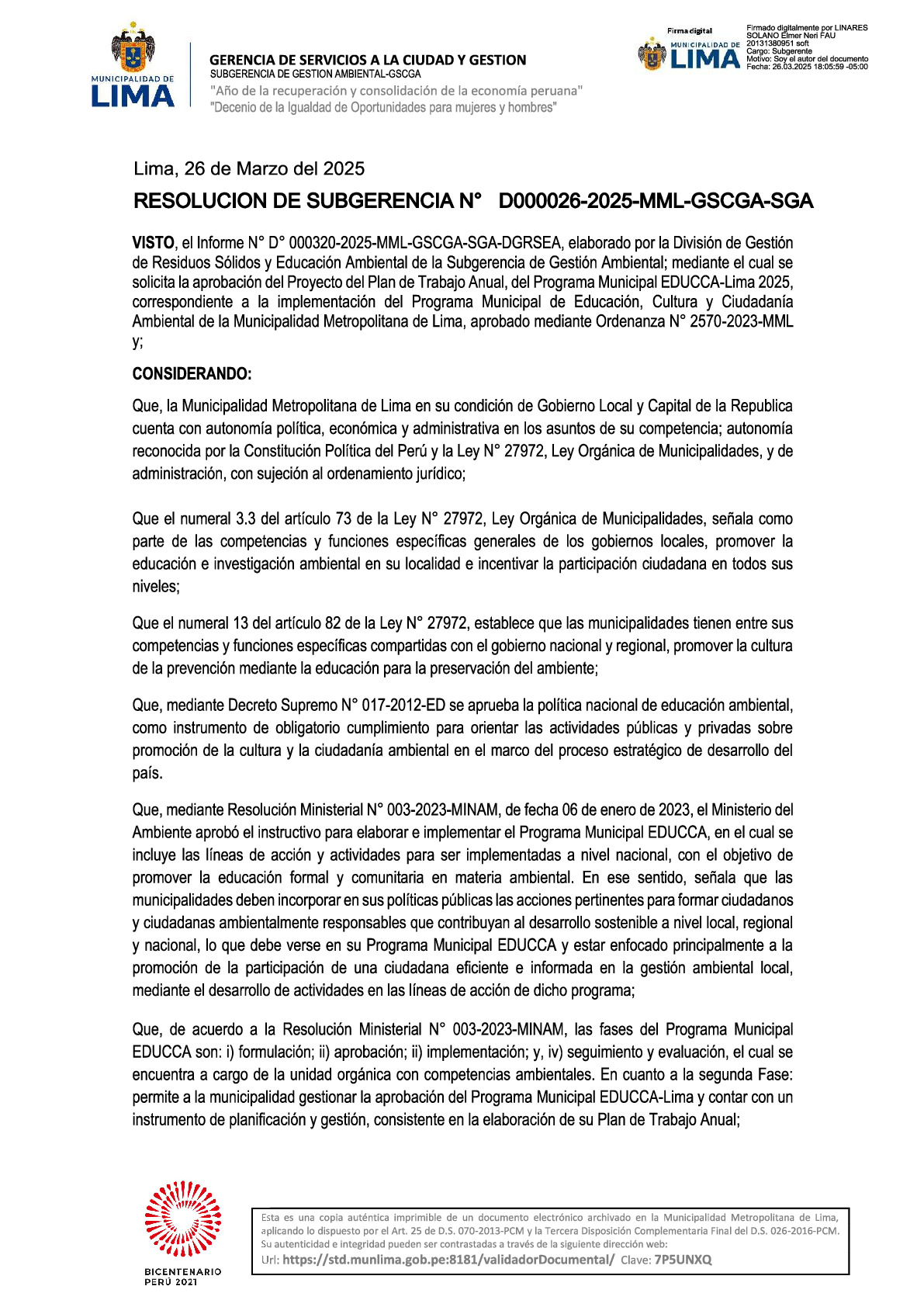 La presente Resolución de Gerencia Municipal aprueba el Plan de Trabajo 2025 del Programa Municipal de Educación, Cultura y Ciudadanía Ambiental de la Municipalidad Metropolitana de Lima (Lima Metropolitana), con la finalidad de definir las actividades de educación, cultura y ciudadanía ambiental que se desarrollaran en la localidad durante el presente año.