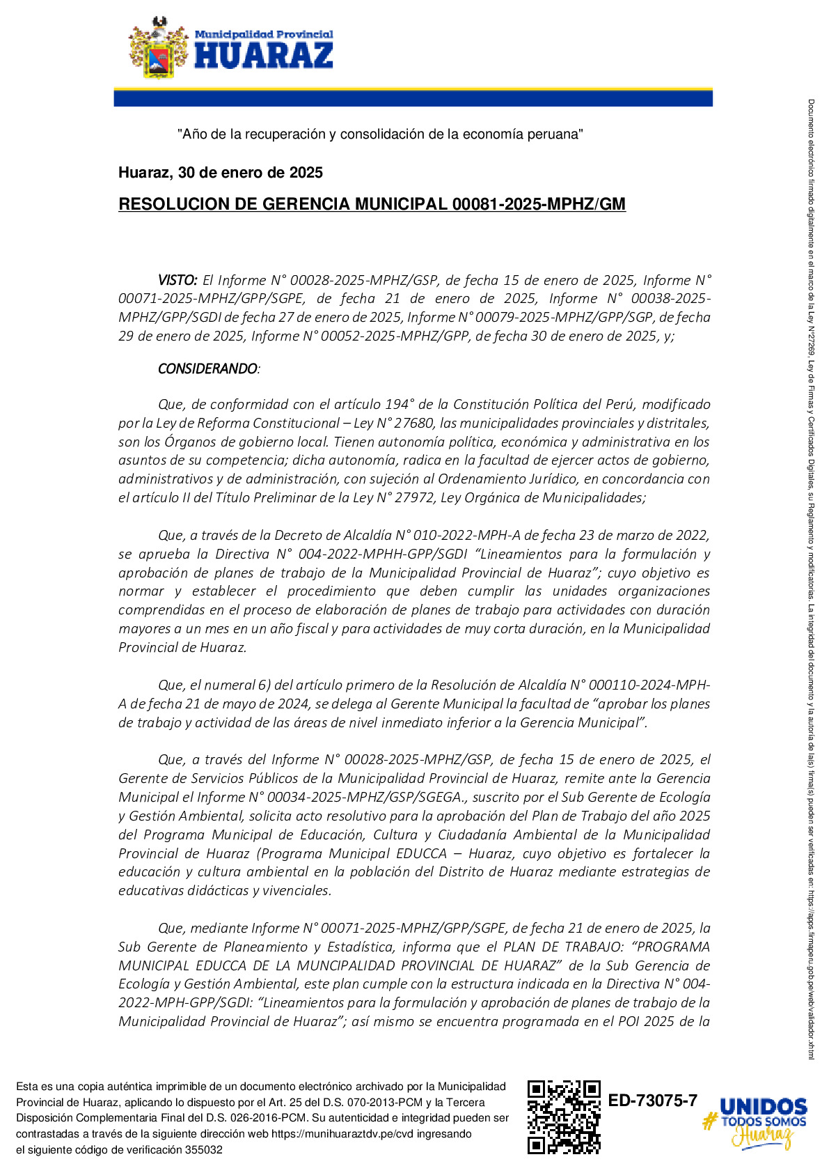 La presente Resolución de Alcaldía aprueba el Plan de Trabajo 2025 del Programa Municipal de Educación, Cultura y Ciudadanía Ambiental de la Municipalidad Provincial de Huaraz - (Áncash), con la finalidad de definir las actividades de educación, cultura y ciudadanía ambiental que se desarrollaran en la localidad durante el presente año.