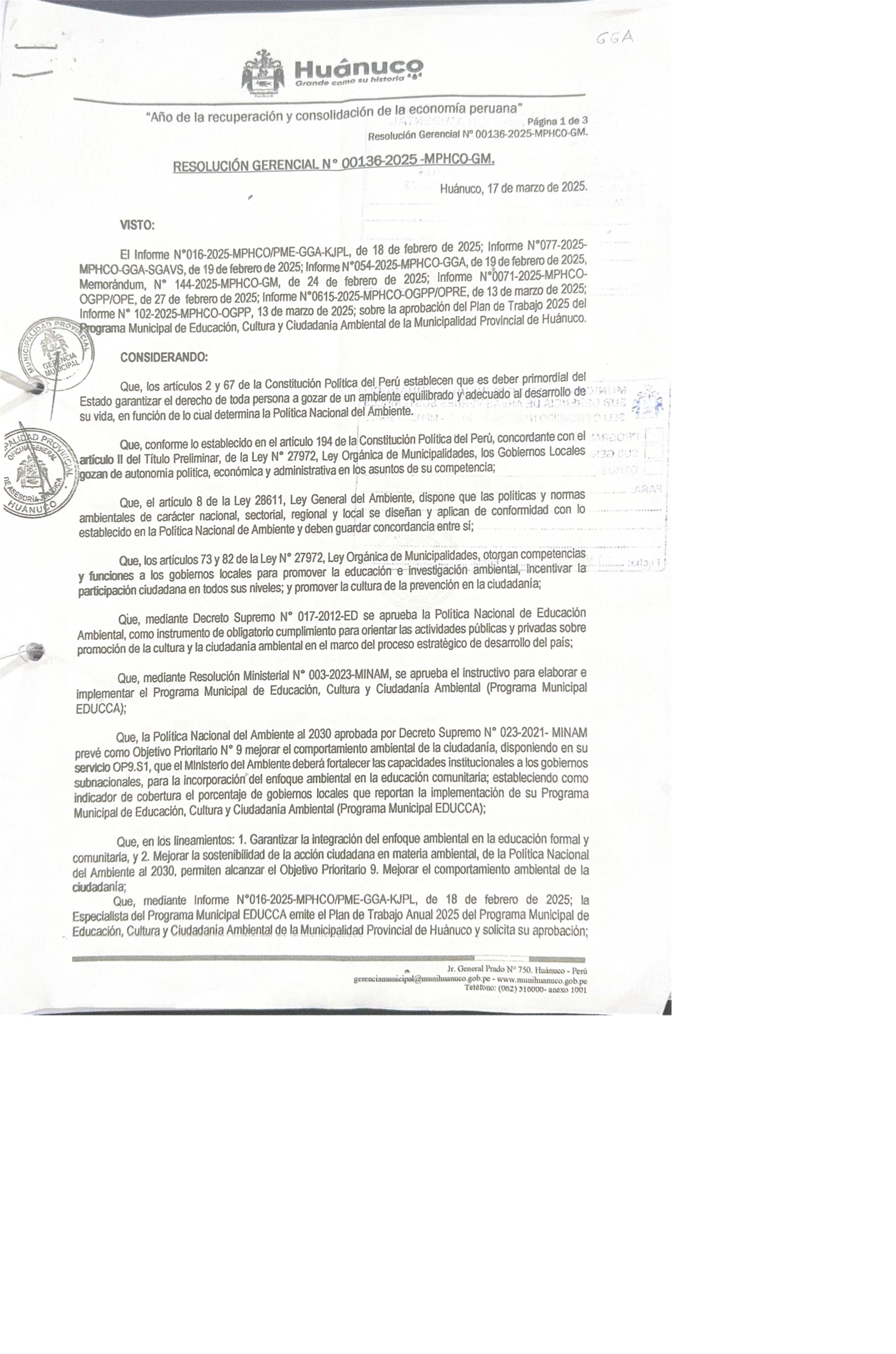 La presente Resolución de Gerencia Municipal aprueba el Plan de Trabajo 2025 del Programa Municipal de Educación, Cultura y Ciudadanía Ambiental de la Municipalidad Provincial de Huánuco - (Huánuco), con la finalidad de definir las actividades de educación, cultura y ciudadanía ambiental que se desarrollaran en la localidad durante el presente año.