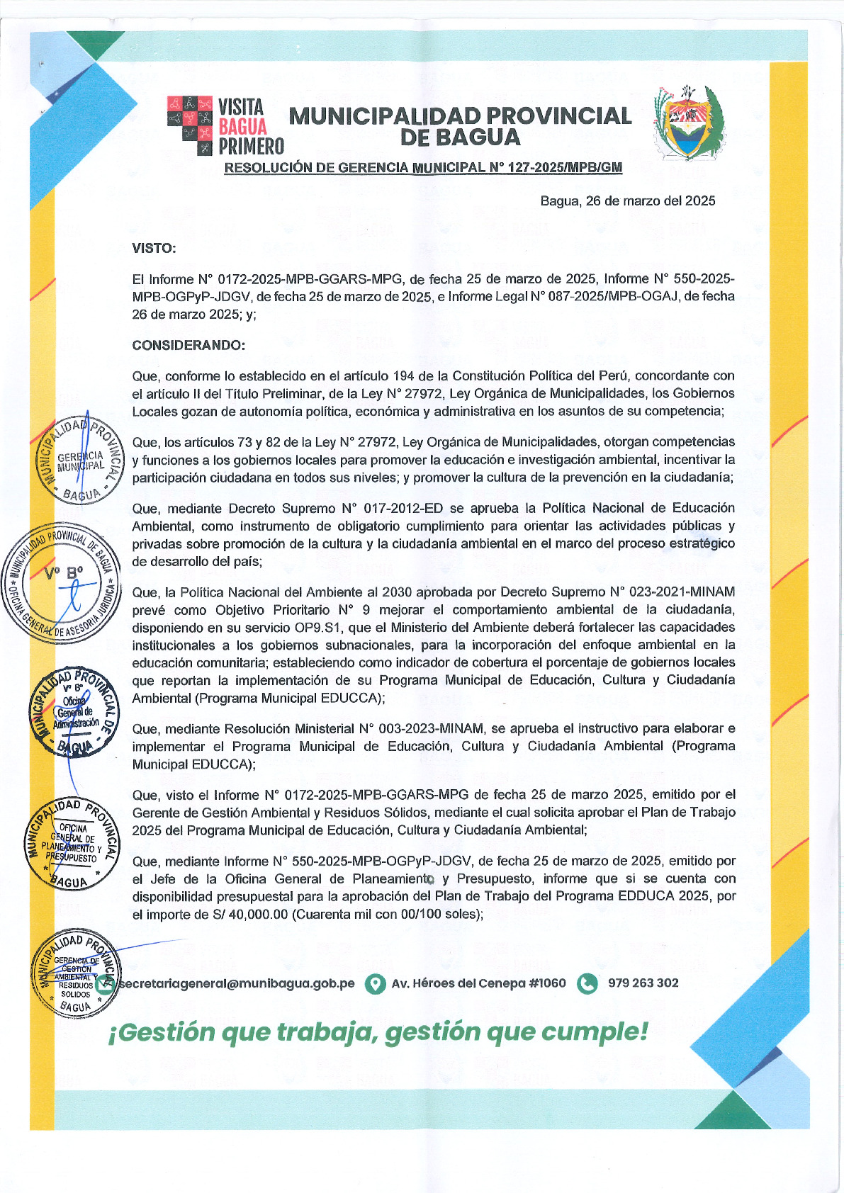 La presente Resolución de Gerencia Municipal aprueba el Plan de Trabajo 2025 del Programa Municipal de Educación, Cultura y Ciudadanía Ambiental de la Municipalidad Provincial de Bagua - (Amazonas), con la finalidad de definir las actividades de educación, cultura y ciudadanía ambiental que se desarrollaran en la localidad durante el presente año.