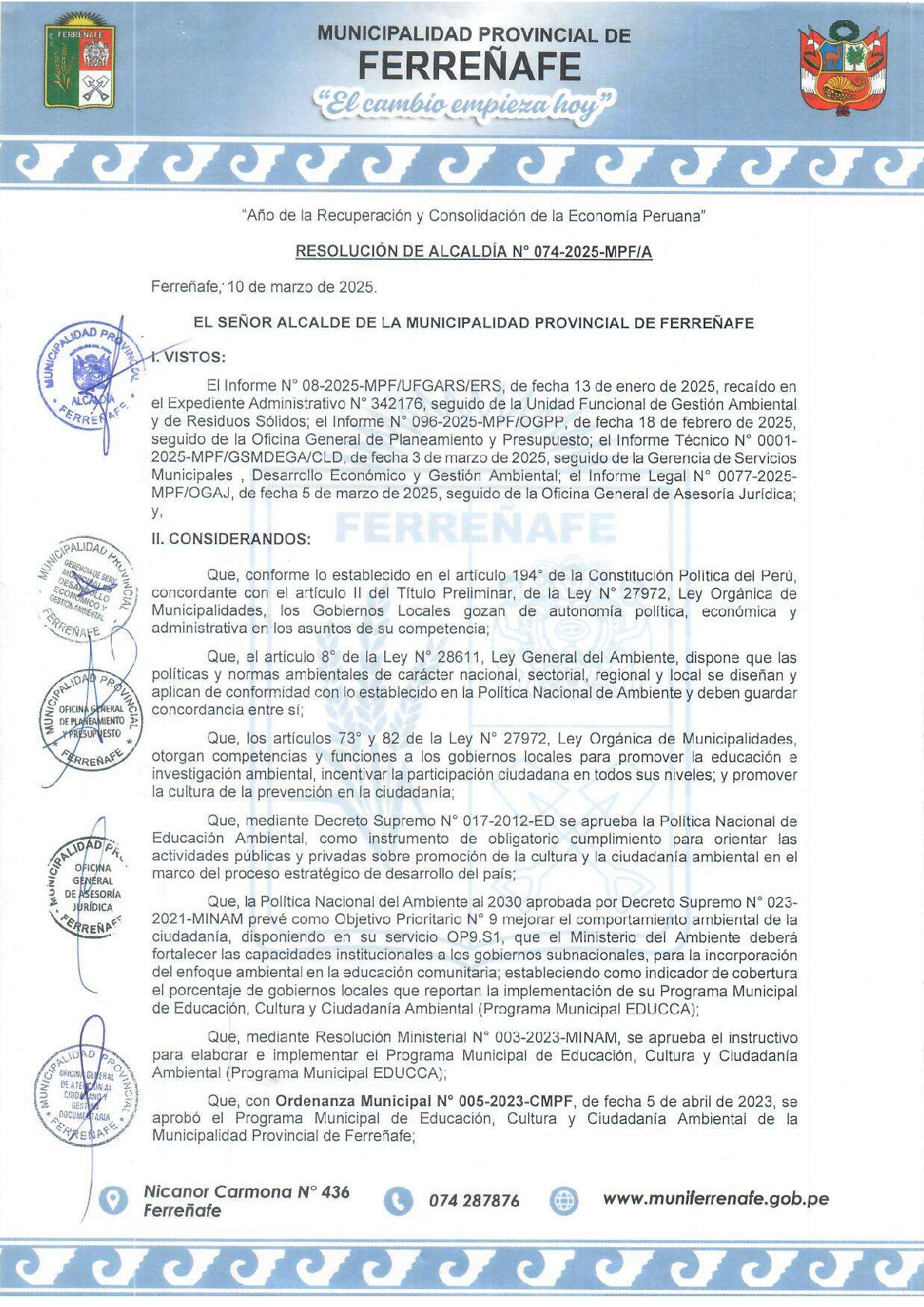 La presente Resolución de Alcaldía aprueba el Plan de Trabajo 2025 del Programa Municipal de Educación, Cultura y Ciudadanía Ambiental de la Municipalidad Provincial de Ferreñafe - Ferreñafe (Lambayeque), con la finalidad de definir las actividades de educación, cultura y ciudadanía ambiental que se desarrollaran en la localidad durante el presente año.