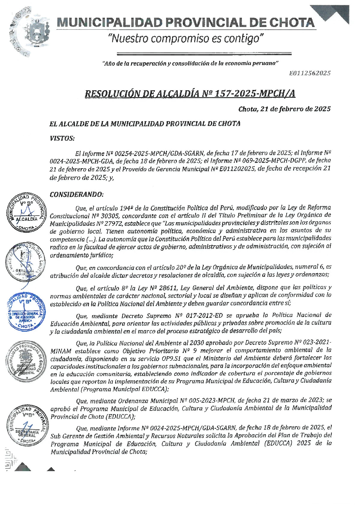 La presente Resolución de Alcaldía aprueba el Plan de Trabajo 2025 del Programa Municipal de Educación, Cultura y Ciudadanía Ambiental de la Municipalidad Provincial de Chota - Chota (Cajamarca), con la finalidad de definir las actividades de educación, cultura y ciudadanía ambiental que se desarrollaran en la localidad durante el presente año.