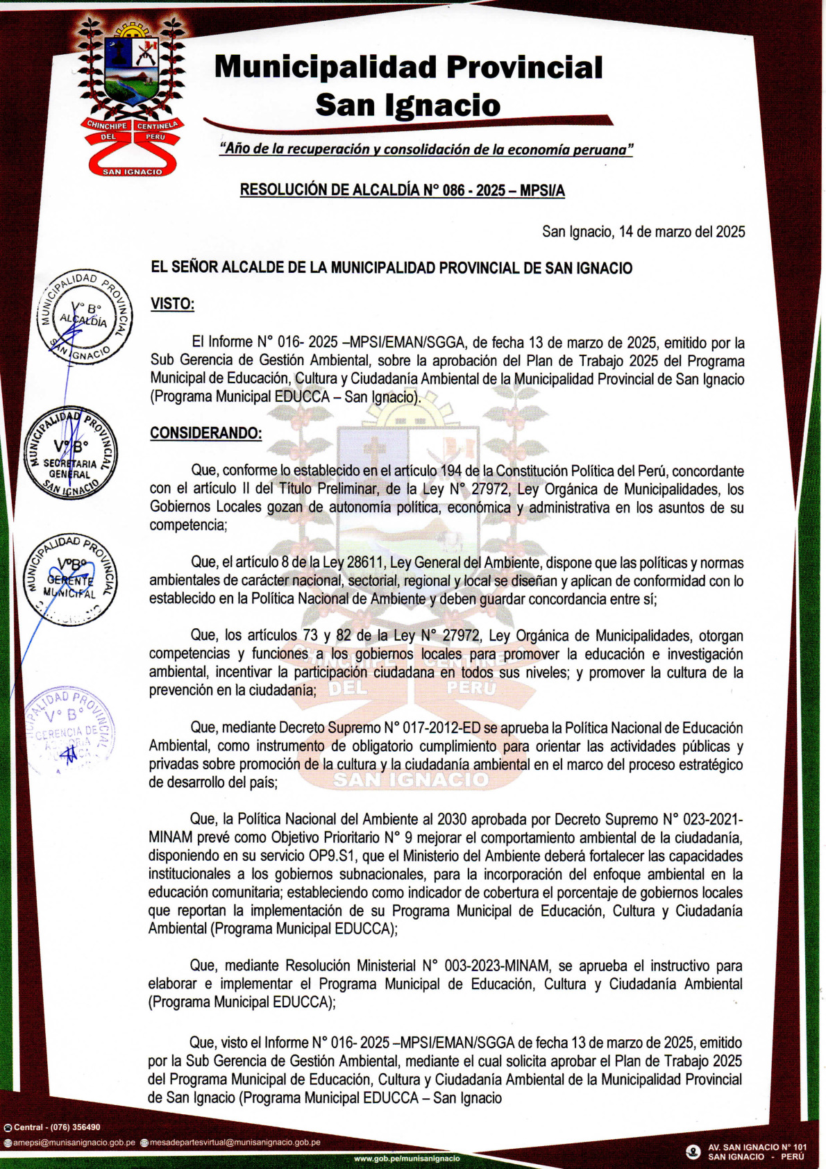 La presente Resolución de Alcaldía aprueba el Plan de Trabajo 2025 del Programa Municipal de Educación, Cultura y Ciudadanía Ambiental de la Municipalidad Provincial de San Ignacio - San Ignacio (Cajamarca), con la finalidad de definir las actividades de educación, cultura y ciudadanía ambiental que se desarrollaran en la localidad durante el presente año.