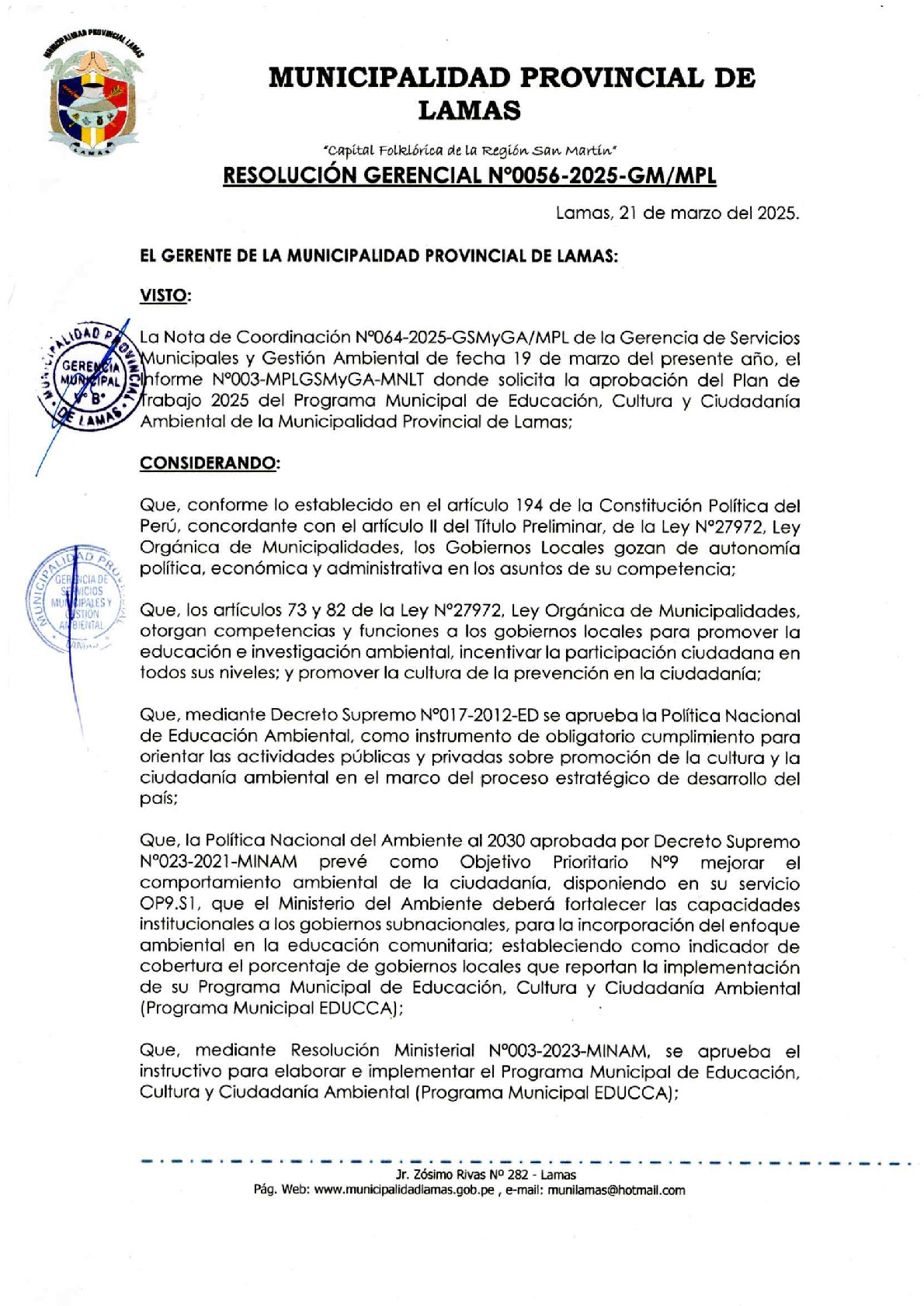 La presente Resolución de Gerencia Municipal aprueba el Plan de Trabajo 2025 del Programa Municipal de Educación, Cultura y Ciudadanía Ambiental de la Municipalidad Provincial de Lamas - Lamas (San Martín), con la finalidad de definir las actividades de educación, cultura y ciudadanía ambiental que se desarrollaran en la localidad durante el presente año.