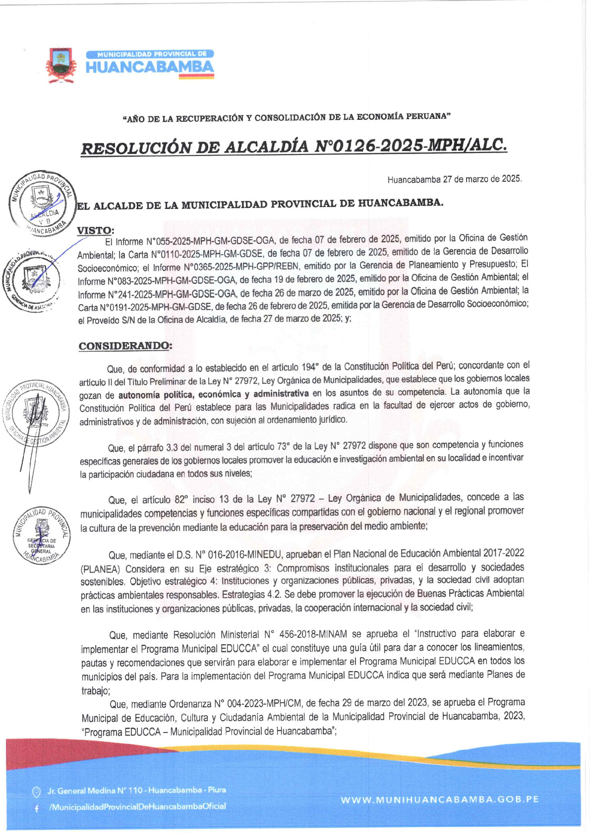 La presente Resolución de Alcaldía aprueba el Plan de Trabajo 2025 del Programa Municipal de Educación, Cultura y Ciudadanía Ambiental de la Municipalidad Provincial de Huancabamba - Huancabamba (Piura), con la finalidad de definir las actividades de educación, cultura y ciudadanía ambiental que se desarrollaran en la localidad durante el presente año.