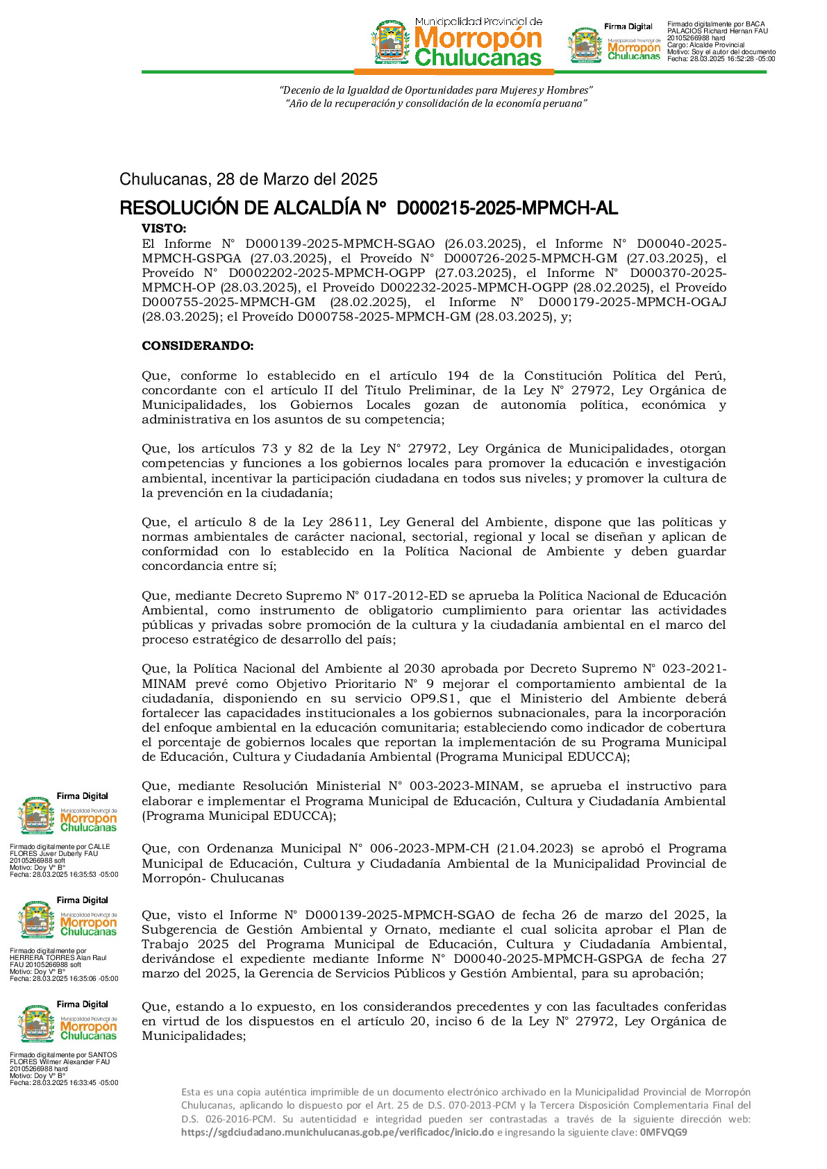 La presente Resolución de Alcaldía aprueba el Plan de Trabajo 2025 del Programa Municipal de Educación, Cultura y Ciudadanía Ambiental de la Municipalidad Provincial de Morropón - Morropón (Piura), con la finalidad de definir las actividades de educación, cultura y ciudadanía ambiental que se desarrollaran en la localidad durante el presente año.