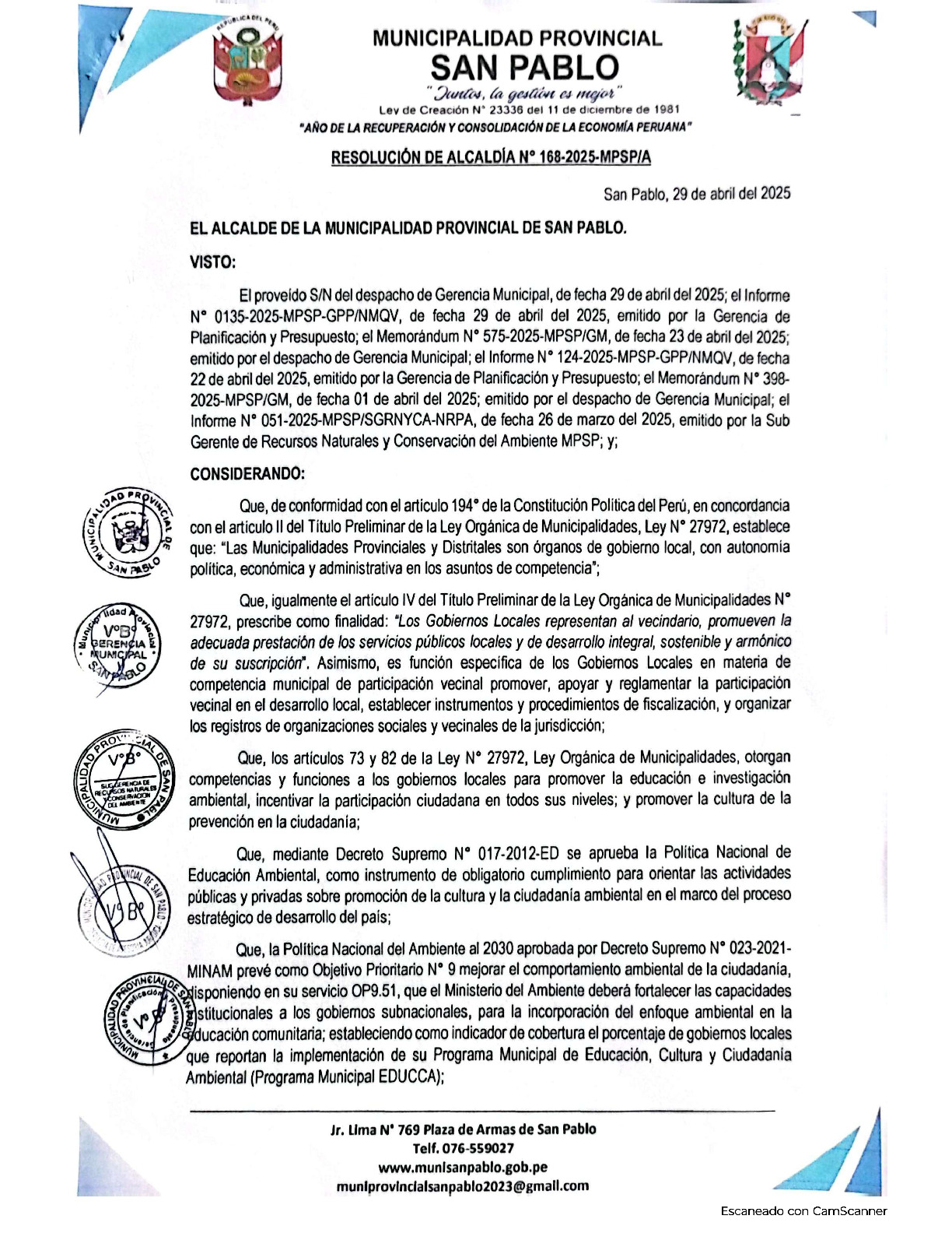La presente Resolución de Alcaldía aprueba el Plan de Trabajo 2025 del Programa Municipal de Educación, Cultura y Ciudadanía Ambiental de la Municipalidad Provincial de San Pablo - San Pablo (Cajamarca), con la finalidad de definir las actividades de educación, cultura y ciudadanía ambiental que se desarrollaran en la localidad durante el presente año.