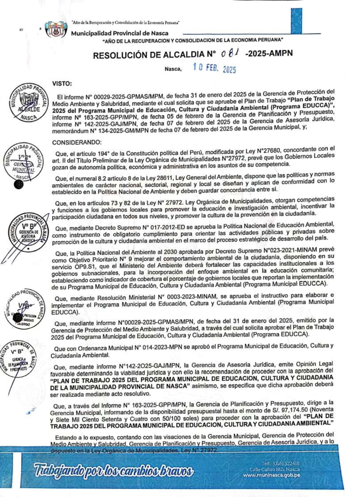 La presente Resolución de Alcaldía aprueba el Plan de Trabajo 2025 del Programa Municipal de Educación, Cultura y Ciudadanía Ambiental de la Municipalidad Provincial de Nasca (Ica), con la finalidad de definir las actividades de educación, cultura y ciudadanía ambiental que se desarrollaran en la localidad durante el presente año.