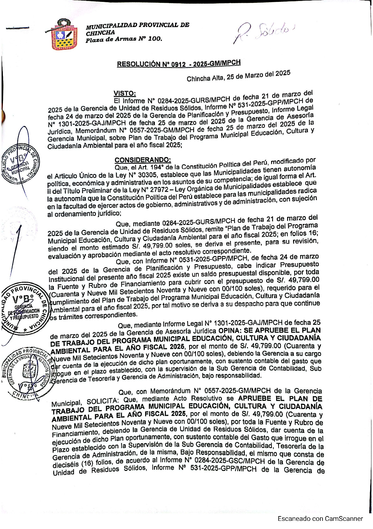 La presente Resolución de Gerencia Municipal aprueba el Plan de Trabajo 2025 del Programa Municipal de Educación, Cultura y Ciudadanía Ambiental de la Municipalidad Provincial de Chincha (Ica), con la finalidad de definir las actividades de educación, cultura y ciudadanía ambiental que se desarrollaran en la localidad durante el presente año.
