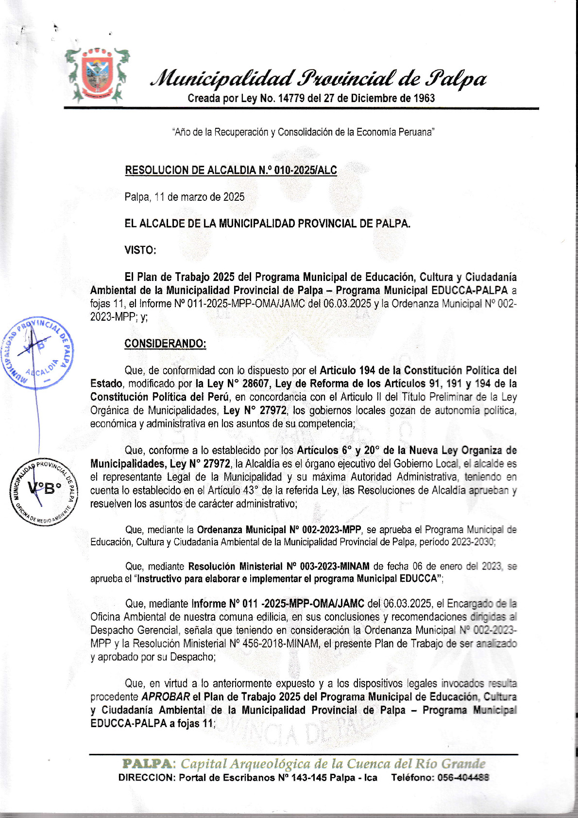 La presente Resolución de Alcaldía aprueba el Plan de Trabajo 2025 del Programa Municipal de Educación, Cultura y Ciudadanía Ambiental de la Municipalidad Provincial de Palpa (Ica), con la finalidad de definir las actividades de educación, cultura y ciudadanía ambiental que se desarrollaran en la localidad durante el presente año.
