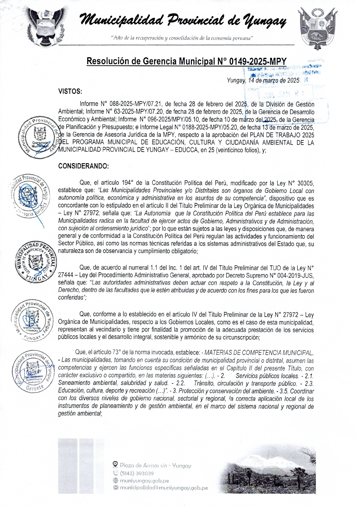 La presente Resolución de Gerencia Municipal aprueba el Plan de Trabajo 2025 del Programa Municipal de Educación, Cultura y Ciudadanía Ambiental de la Municipalidad Provincial de Yungay - (Áncash), con la finalidad de definir las actividades de educación, cultura y ciudadanía ambiental que se desarrollaran en la localidad durante el presente año.