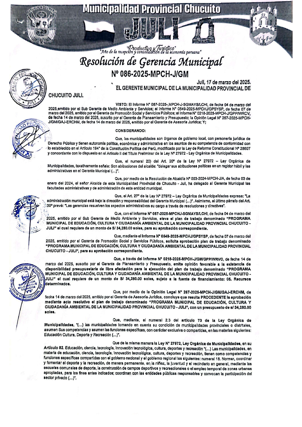 La presente Resolución de Gerencia Municipal aprueba el Plan de Trabajo 2025 del Programa Municipal de Educación, Cultura y Ciudadanía Ambiental de la Municipalidad Provincial de Chucuito (Puno), con la finalidad de definir las actividades de educación, cultura y ciudadanía ambiental que se desarrollaran en la localidad durante el presente año.